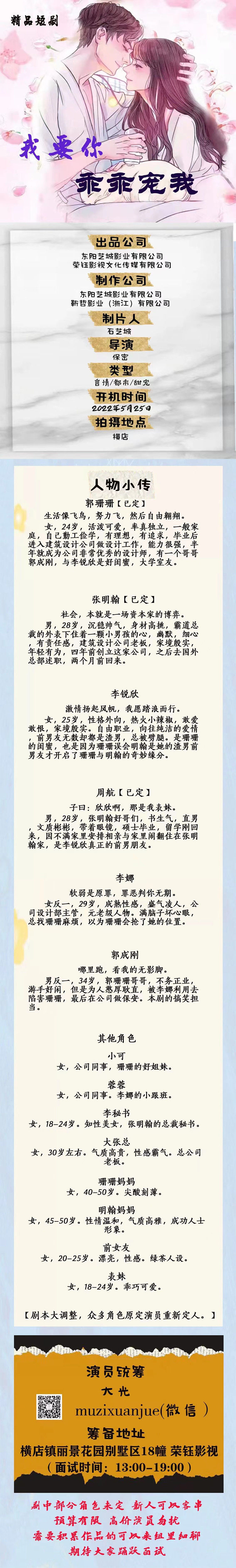 《我要你乖乖宠我》剧本大调整,现改为24集精品短剧。重新定人。推迟到月底开机。众多原定演员调整。欢迎带纸质版资料来组里面试。带新人演员副导演学徒,可以是纯小白。有意向可以报名。
