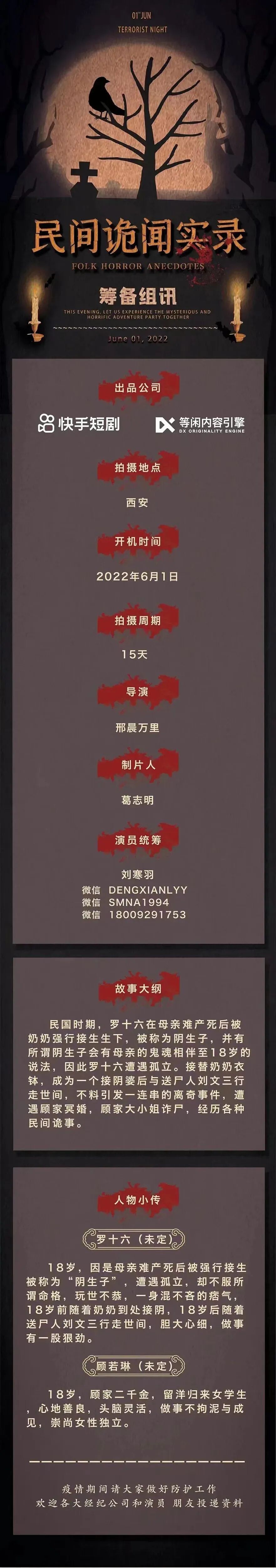由于疫情防控要求剧组展开线上办公及筹备,欢迎各经纪公司、经纪人、演员朋友们根据人物投递电子版资料
