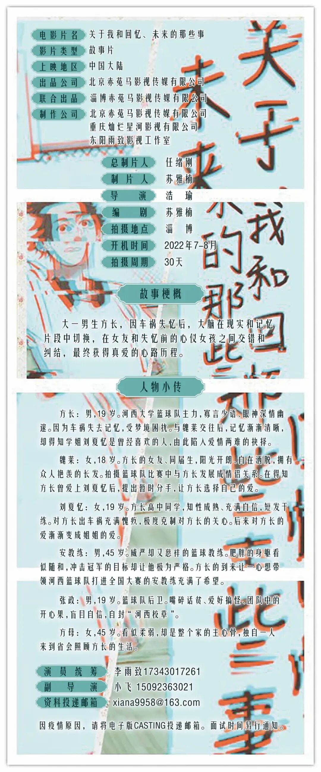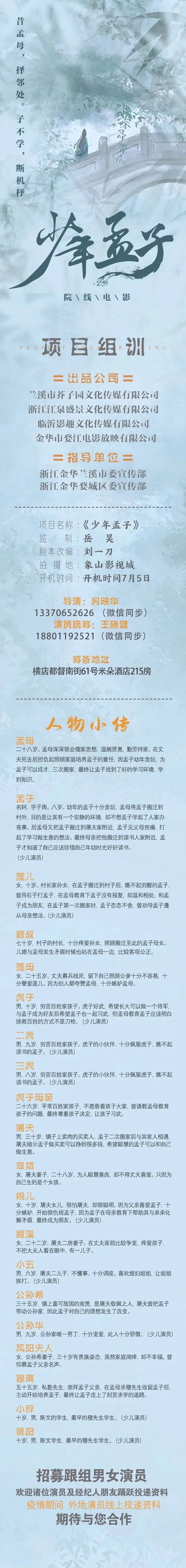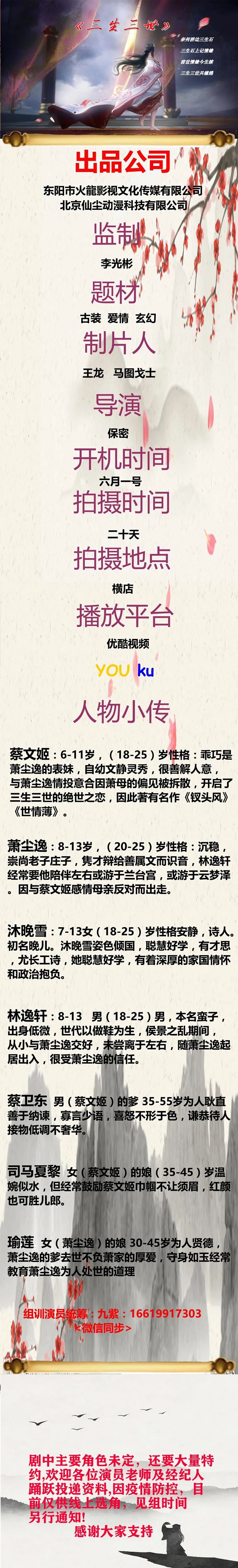 剧中大量角色未定,年龄分布广泛,欢迎各大经纪公司、经纪人、艺人朋友多多推荐!