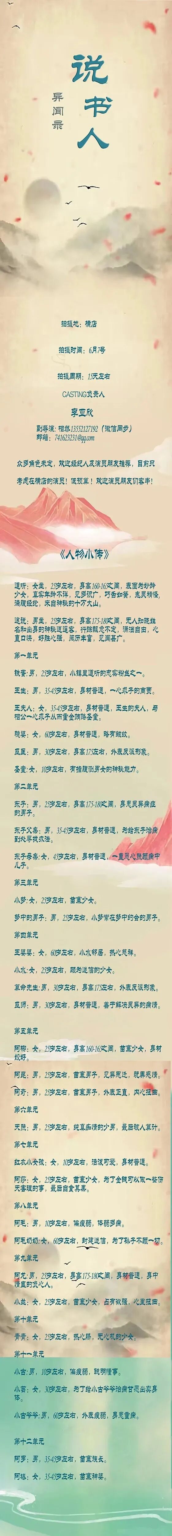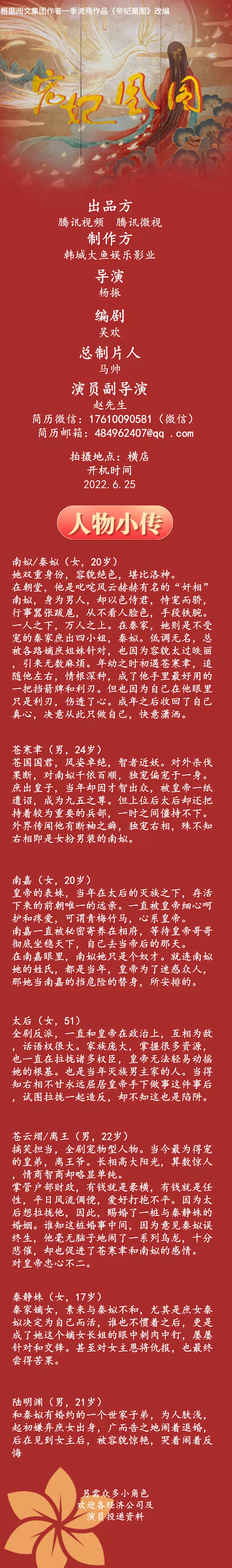 选角导演:小雪 18910641150 (微信同步)