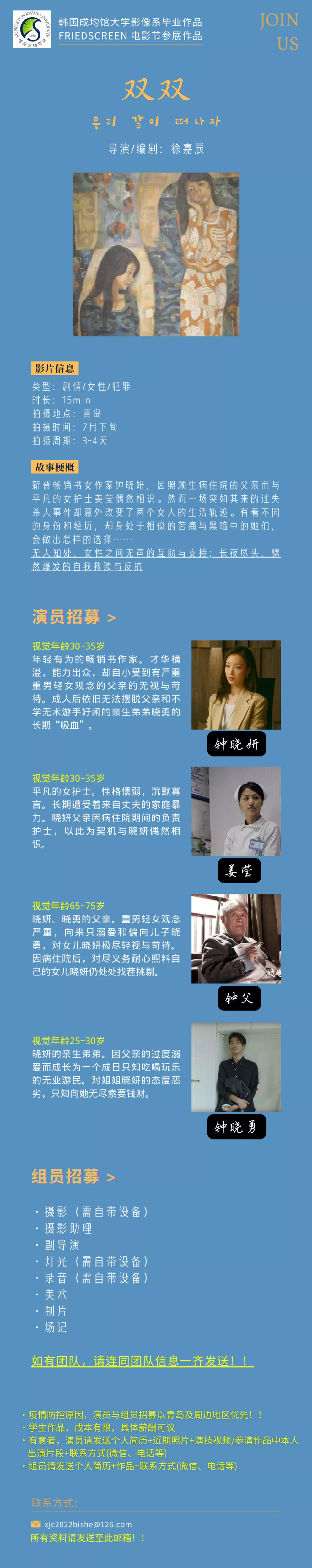 组员招募:摄影(需自带设备)、摄影助理、副导演、灯光(需自带设备)、录音(需自带设备)、美术、制片、场记