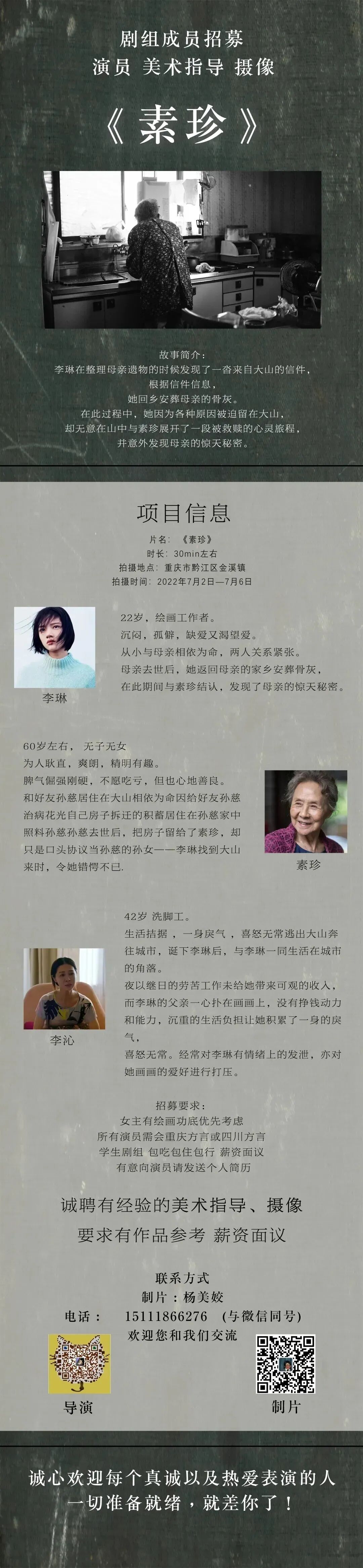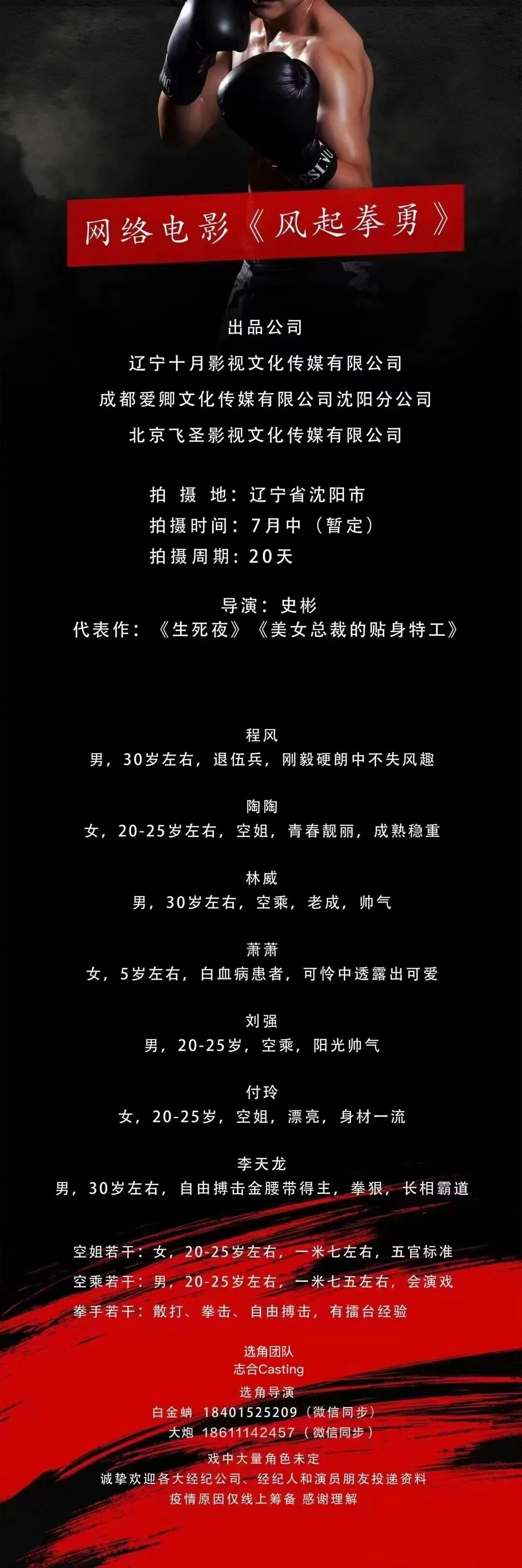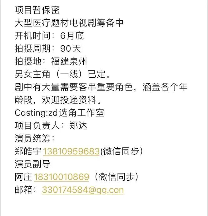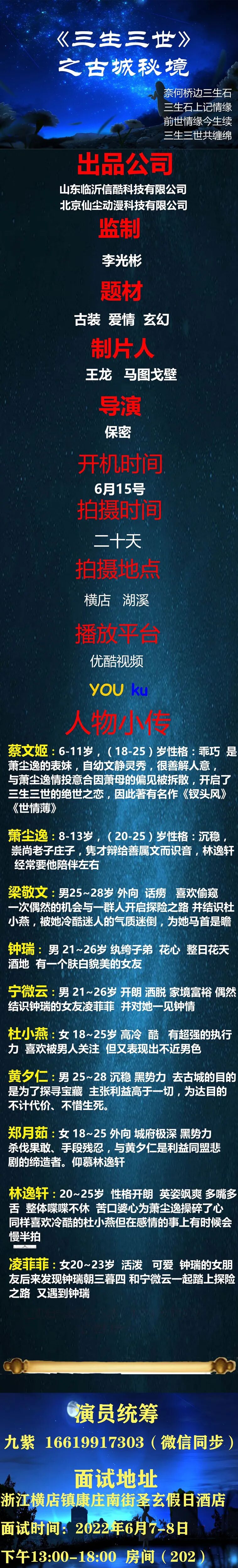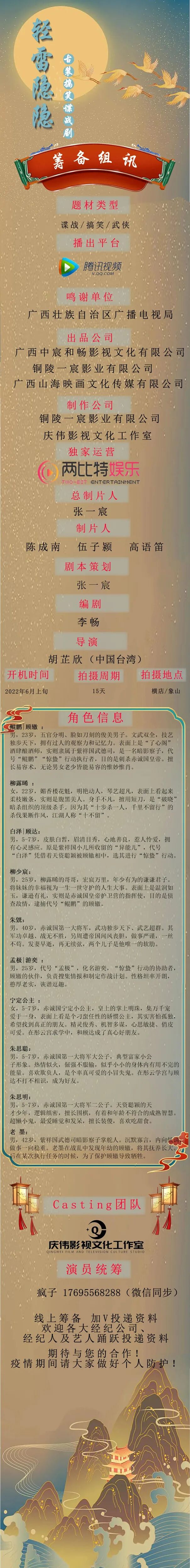 男女主角(一线)已定,剧中有大量需要客串重要角色,涵盖各个年龄段,欢迎投递资料。