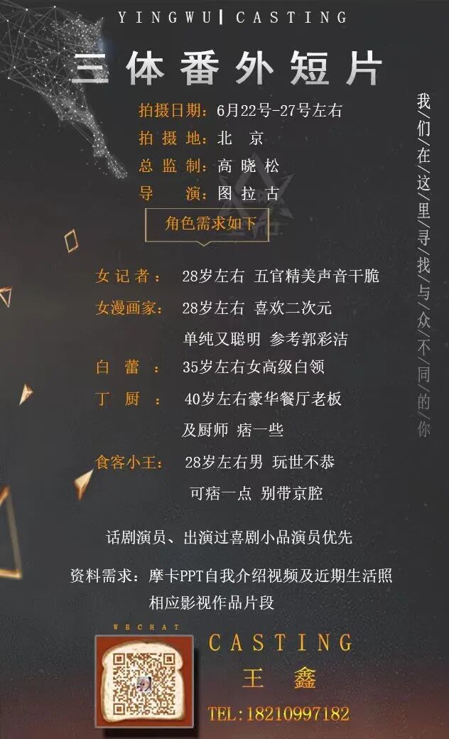 本栏目发布组讯由小编采集与业界共享,组讯如有变化请以实际情况为准。如果遇到剧组收费情况,请谨慎对待并私信官微@戏客Seeker,我们会公示问题组讯并及时处理。谢谢。