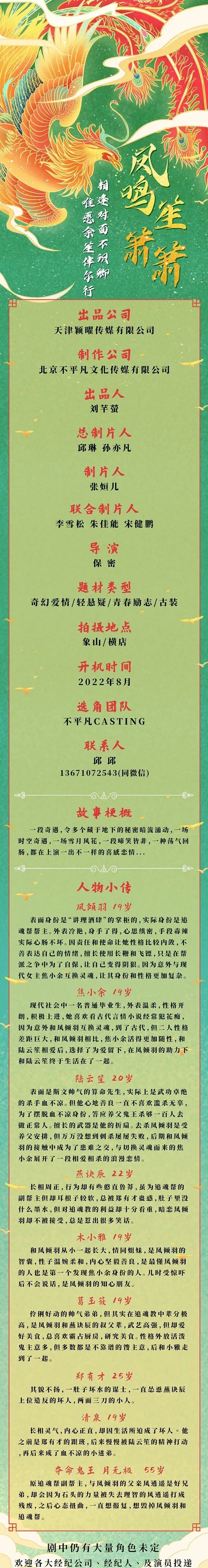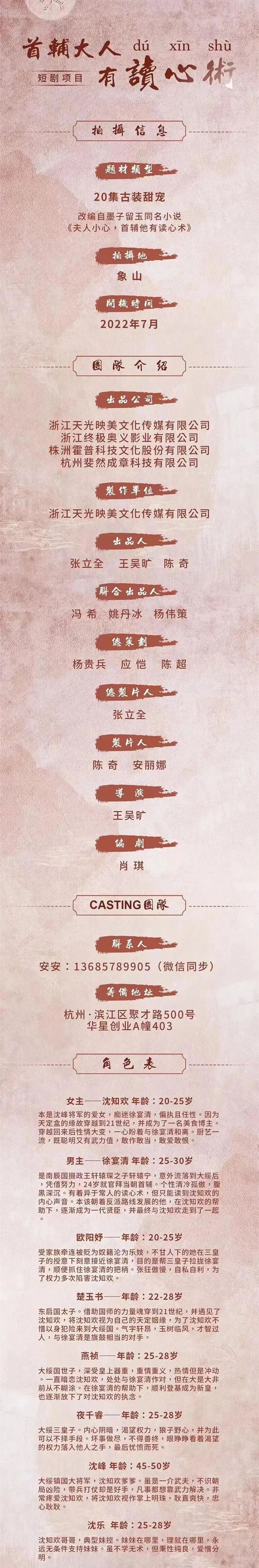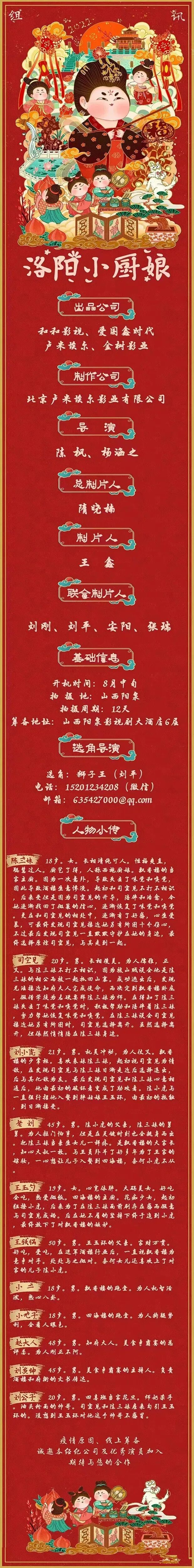 剧中仍有大量角色未定,欢迎各大经纪公司、经纪人、及演员投递。