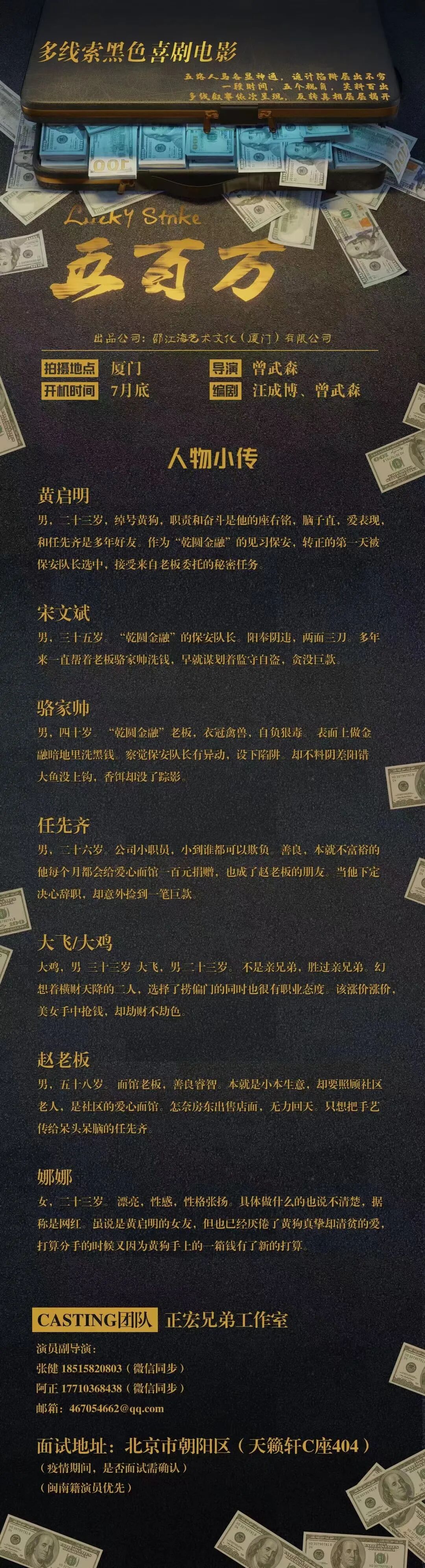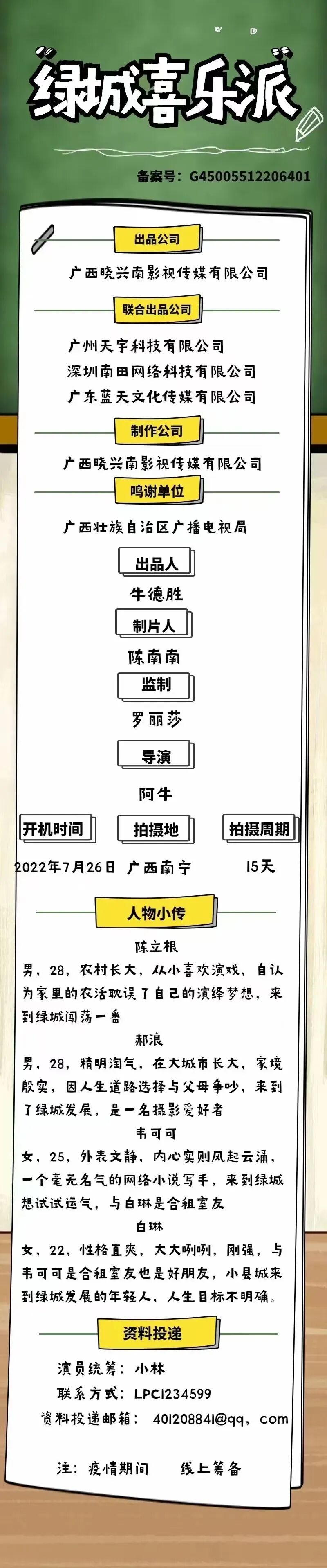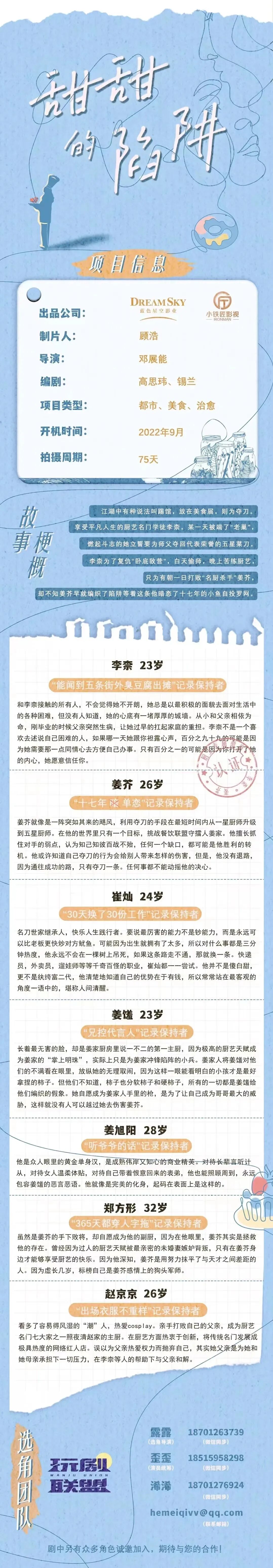 剧中仍有大量角色未定,欢迎各大经纪公司、经纪人、及演员投递。