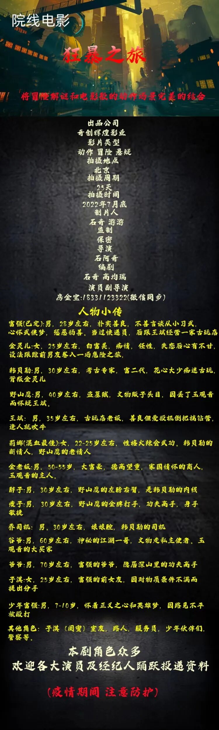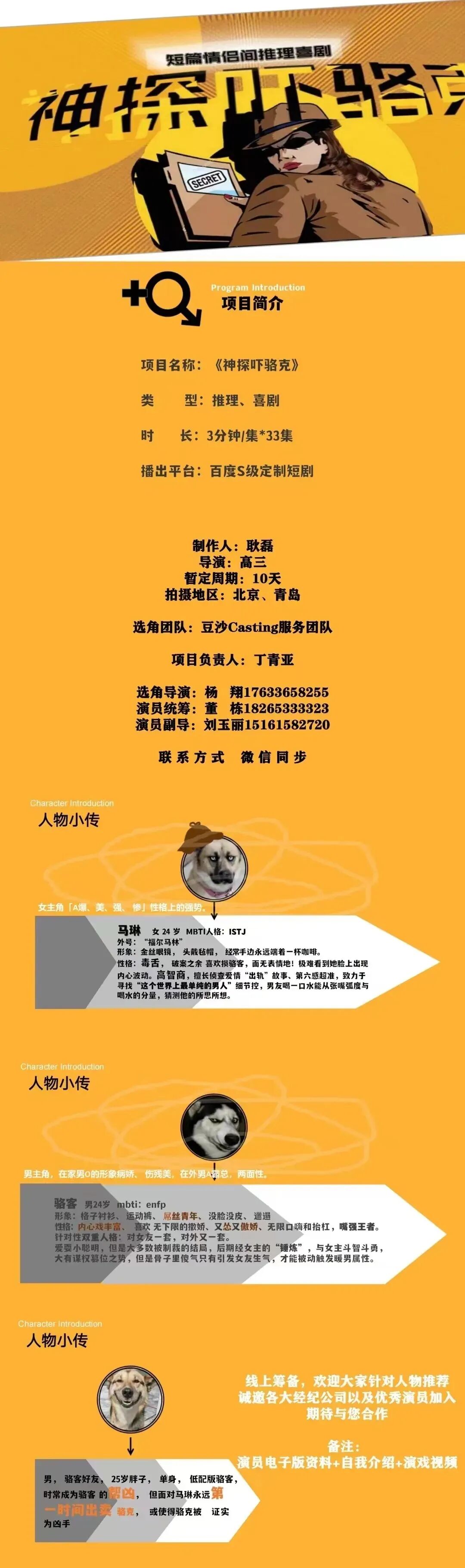 资料投递请以:短片名称+角色名称+演员真实姓名格式发送
