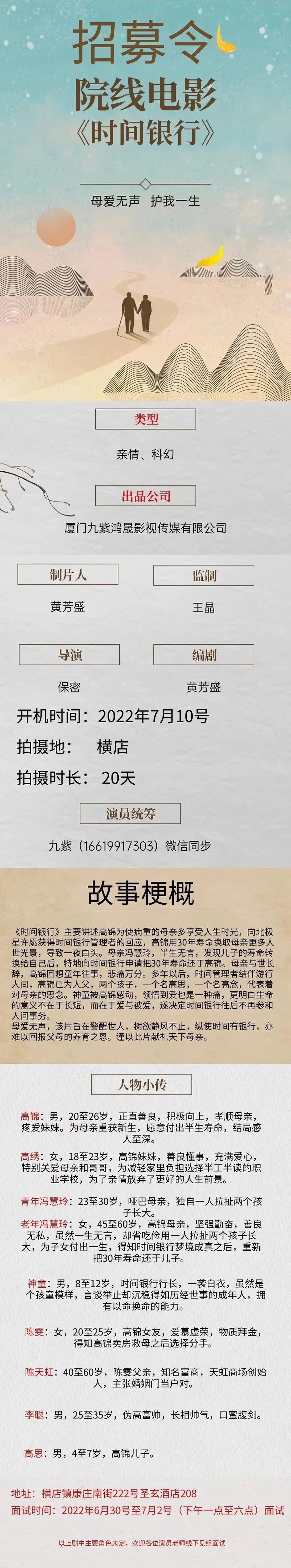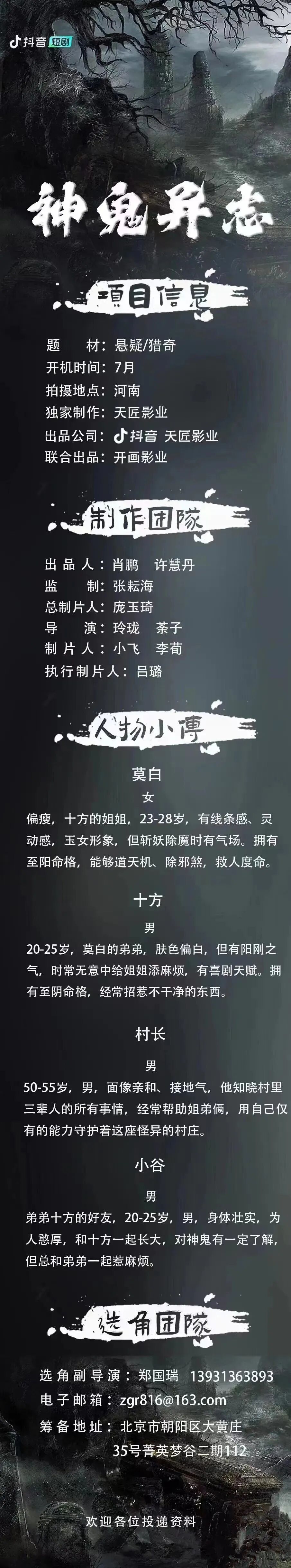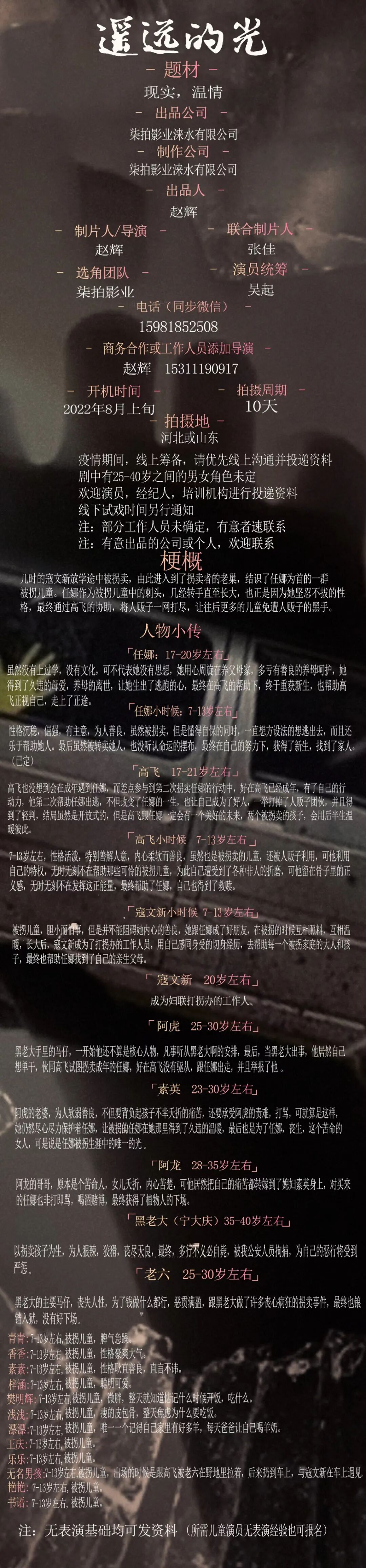 剧中主要角色未定,欢迎各位演员老师线下见组面试。