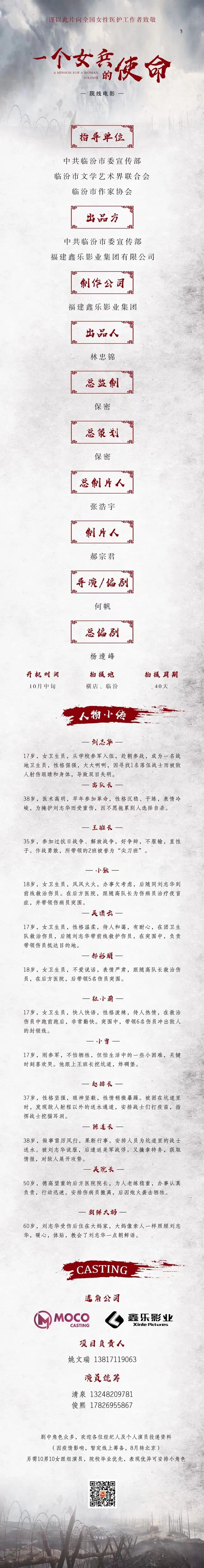 另需10男10女跟组演员,院校毕业优先,表现优异可安排小角色