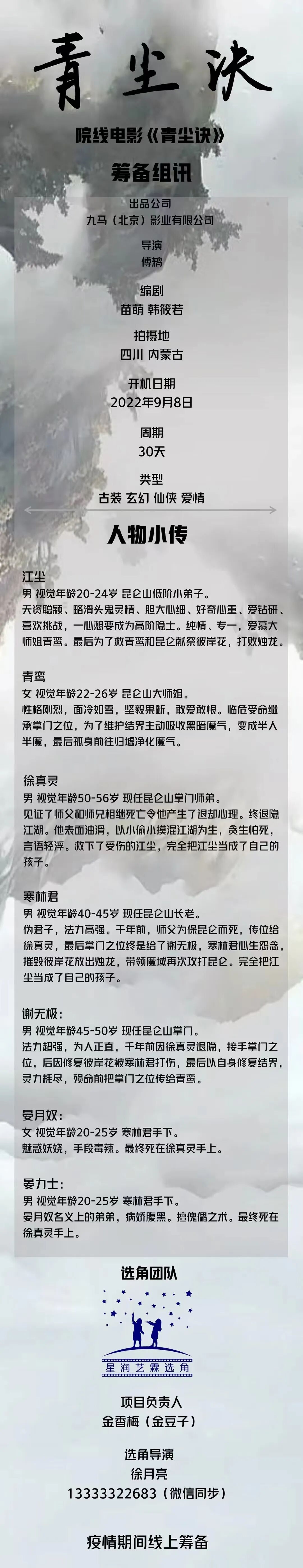 选角导演:徐月亮 13333222683(微信同号)