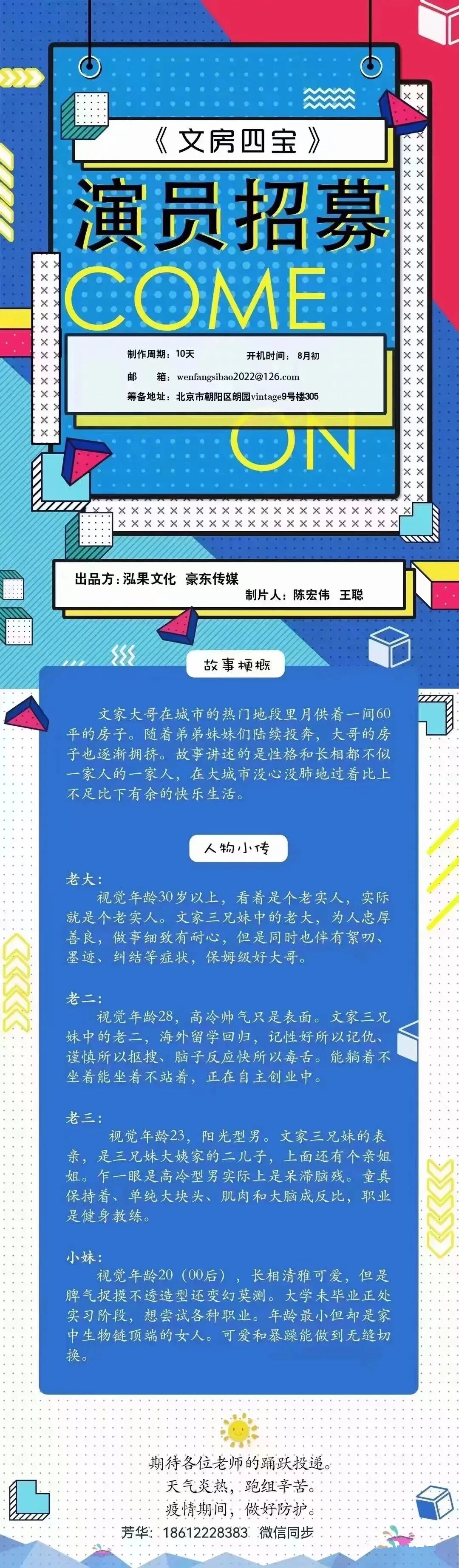 期待各位老师的踊跃投递。天气炎热,跑组辛苦。疫情期间,做好防护。