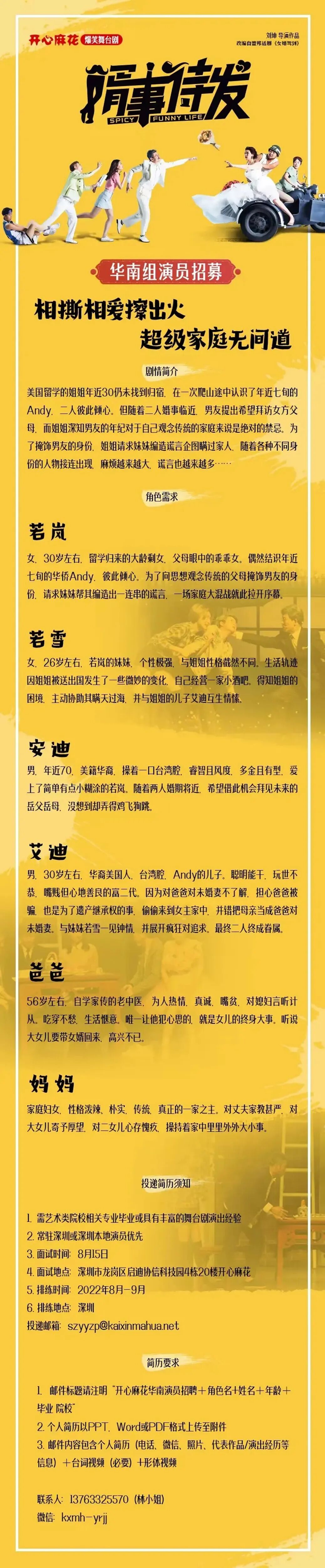1.邮件标题请注明“开心麻花华南演员招聘+角色名+姓名+年龄+毕业院校”