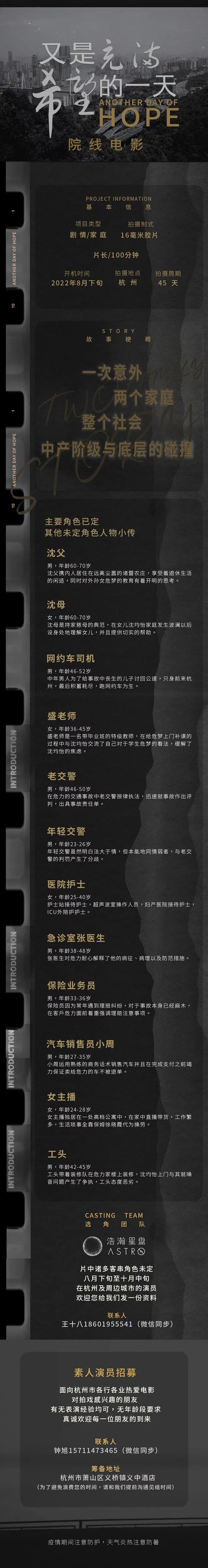 素人演员招募:面向杭州市各行各业热爱电影,对拍戏感兴趣的朋友,有无表演经验均可,无年龄段要求,真诚欢迎每一位朋友的到来
