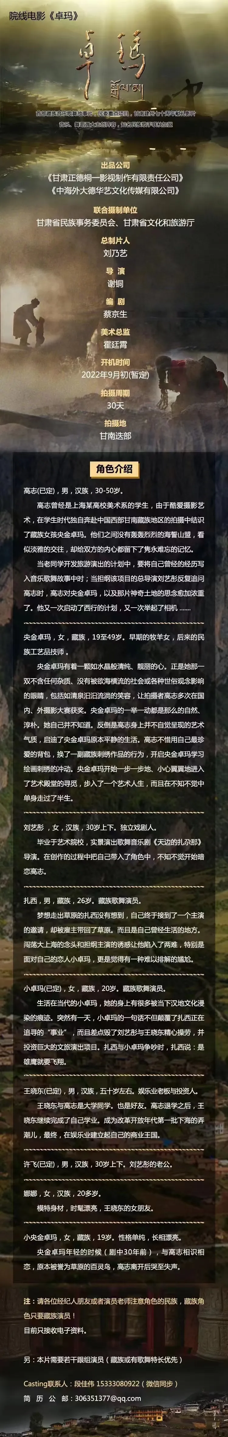 目前只接收电子资料。另:本片需要若干跟组演员(藏族或有歌舞特长优先)