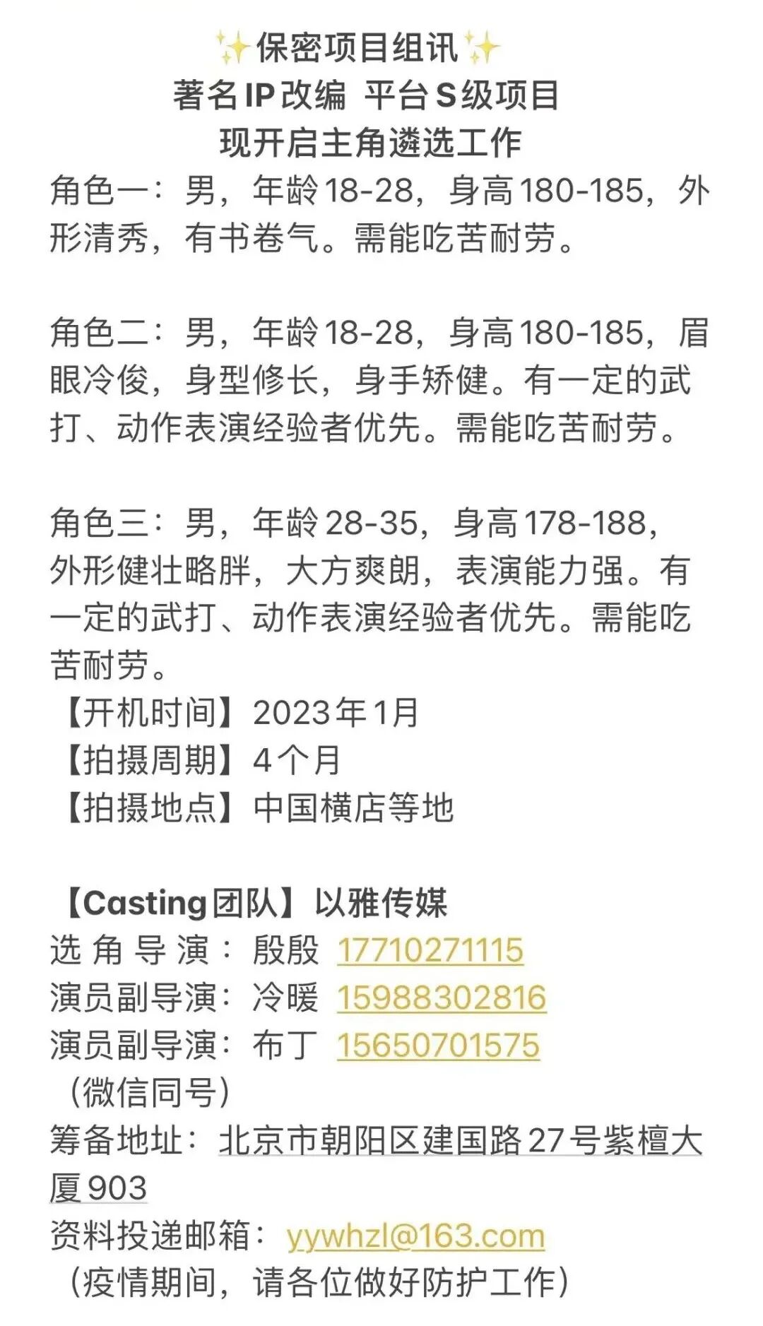 剧中多个角色未定,欢迎各大经纪公司演员资料投递(可线上投递资料)