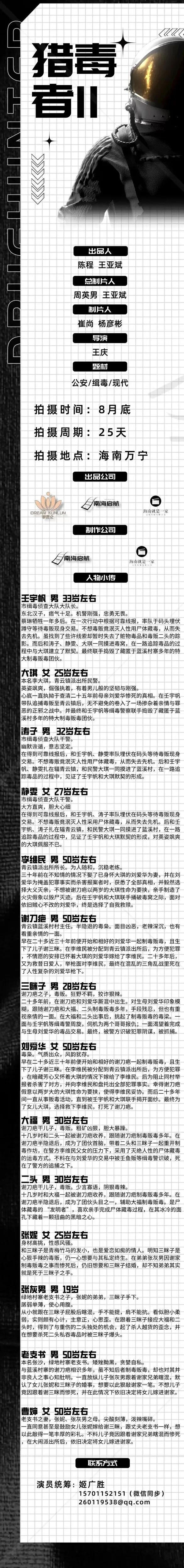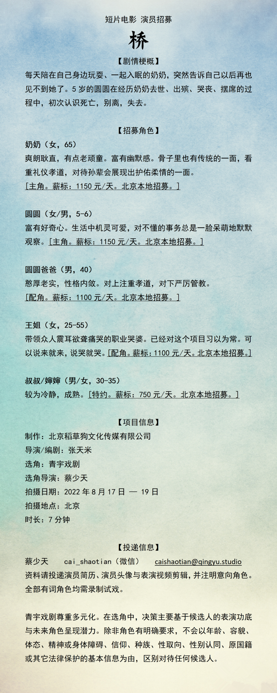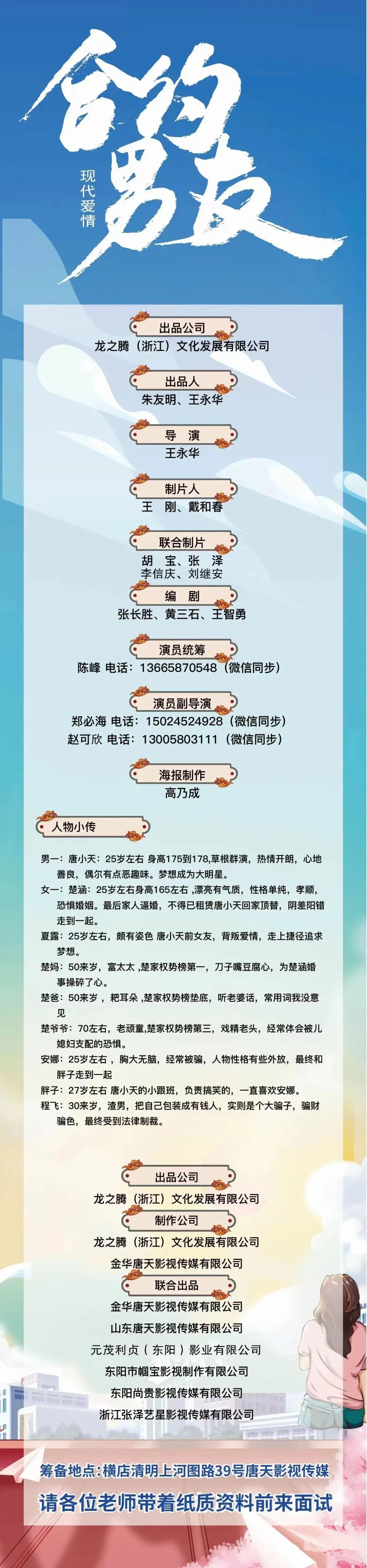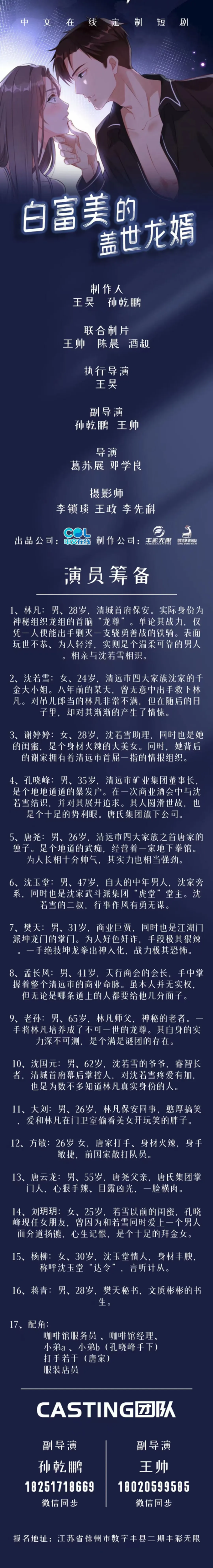 剧中大量角色未定,欢迎各大经纪演员前来投递资料。