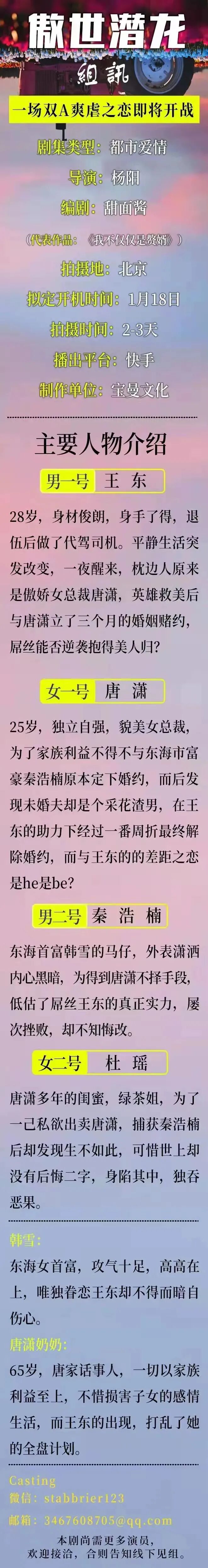 众多角色未定,诚挚欢迎各大经纪公司、经纪人和演员朋友投递资料。