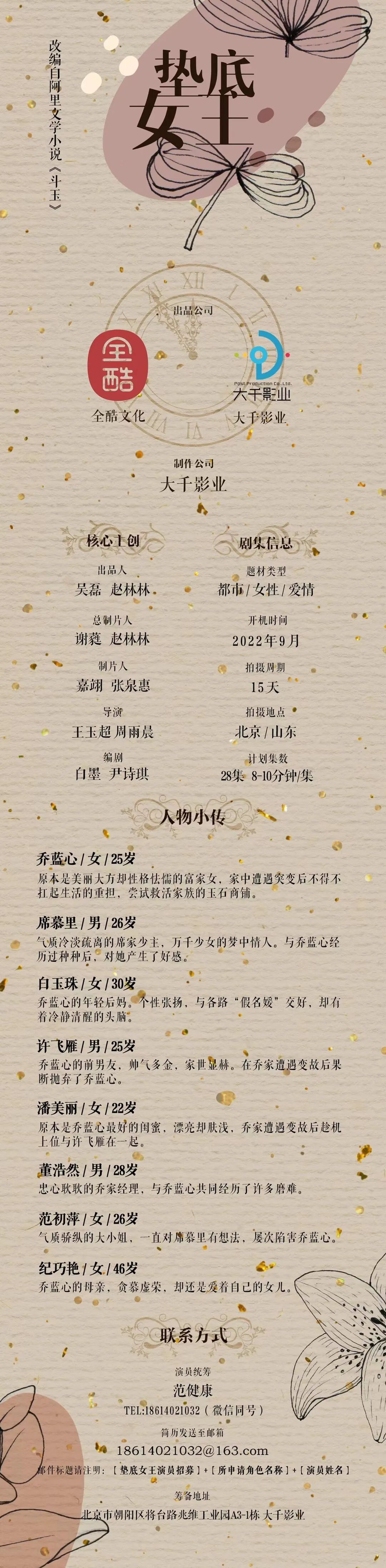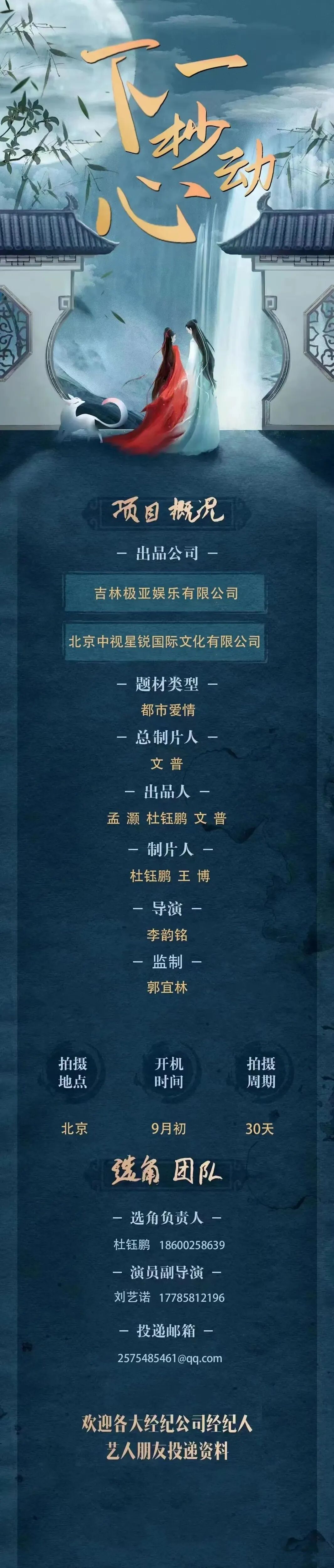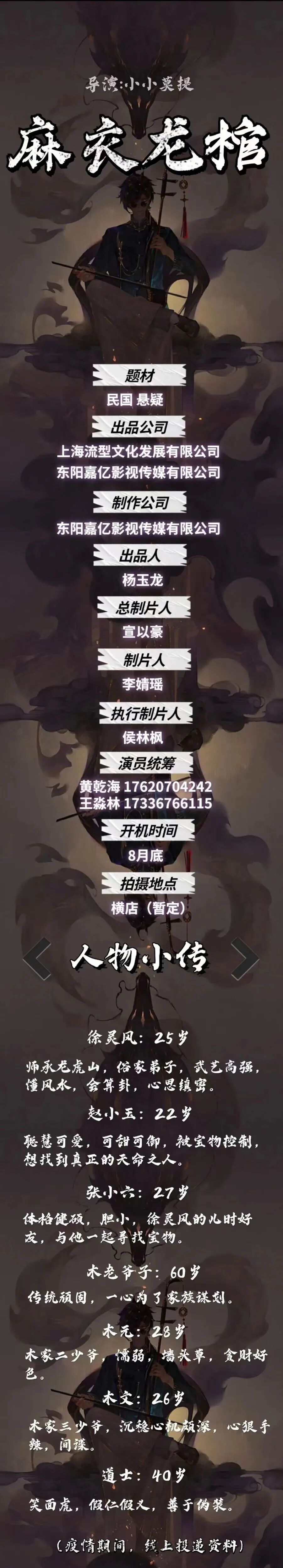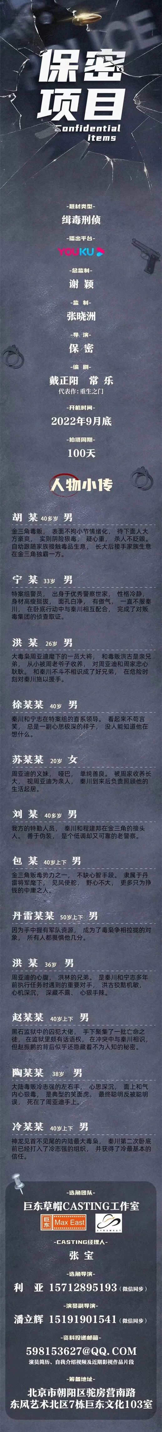 备注:剧中大量人物角色未定,现接收电子资料,欢迎各位演员及经纪人朋友前来投递。