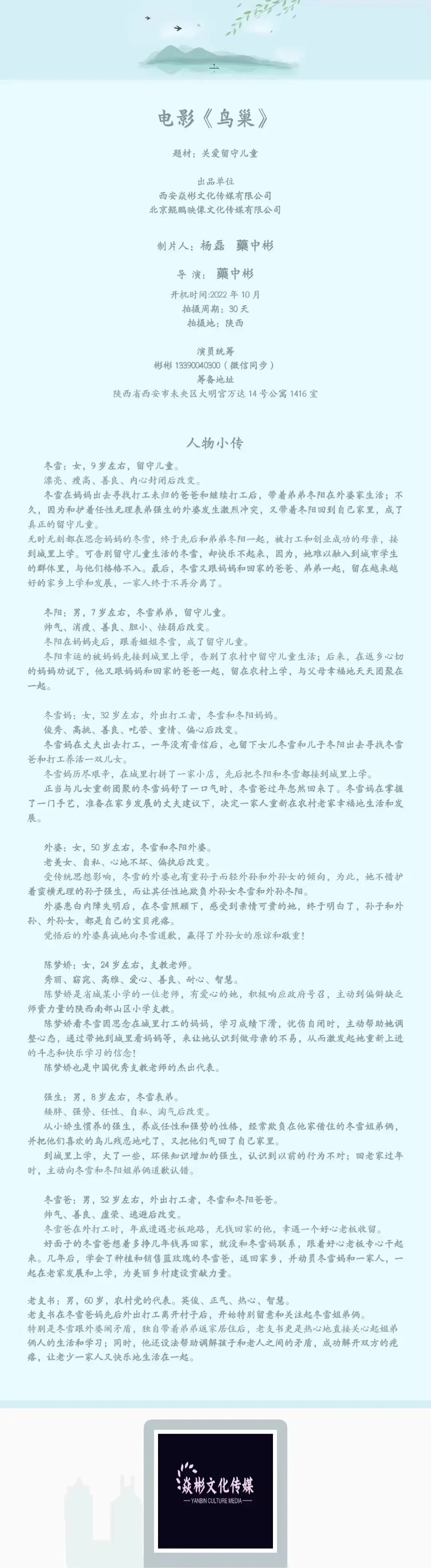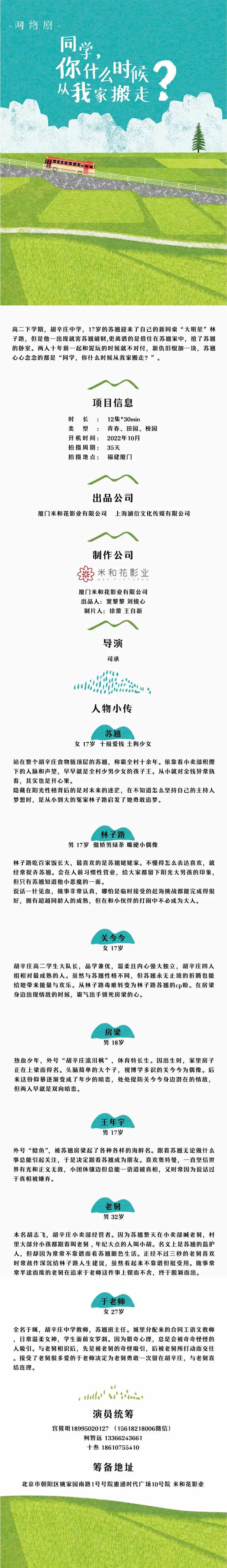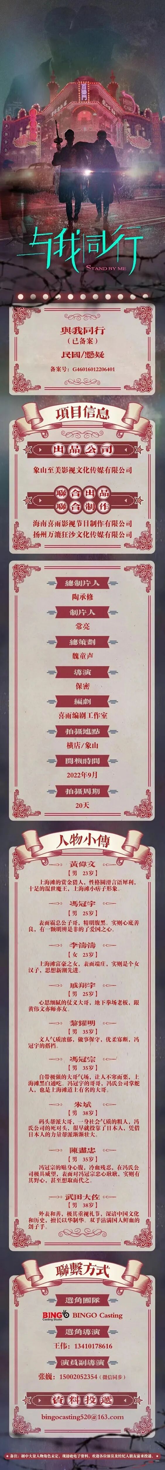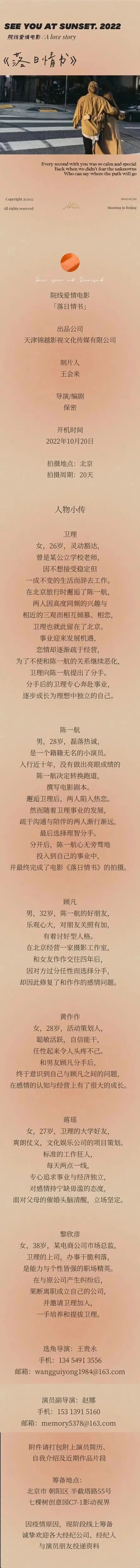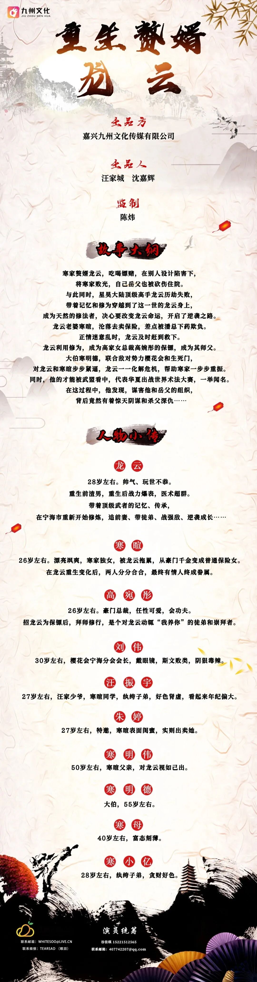 备注:剧中大量人物角色未定,现接收电子资料,欢迎各位演员及经纪人朋友前来投递。