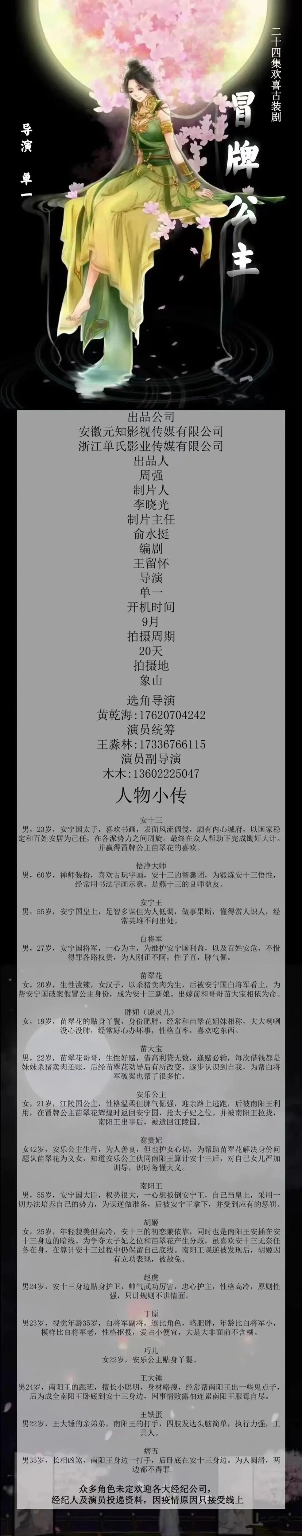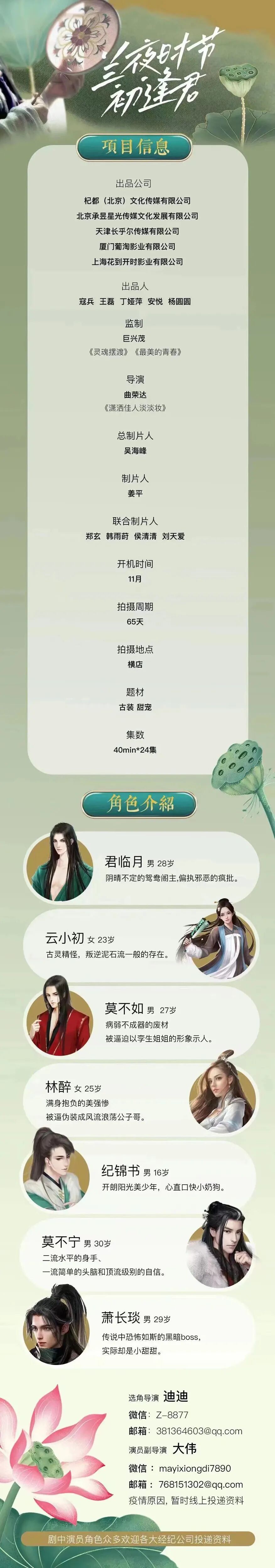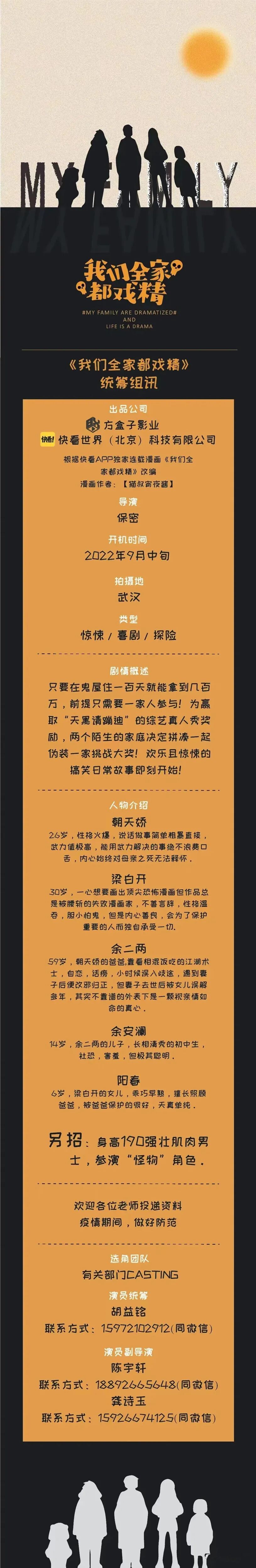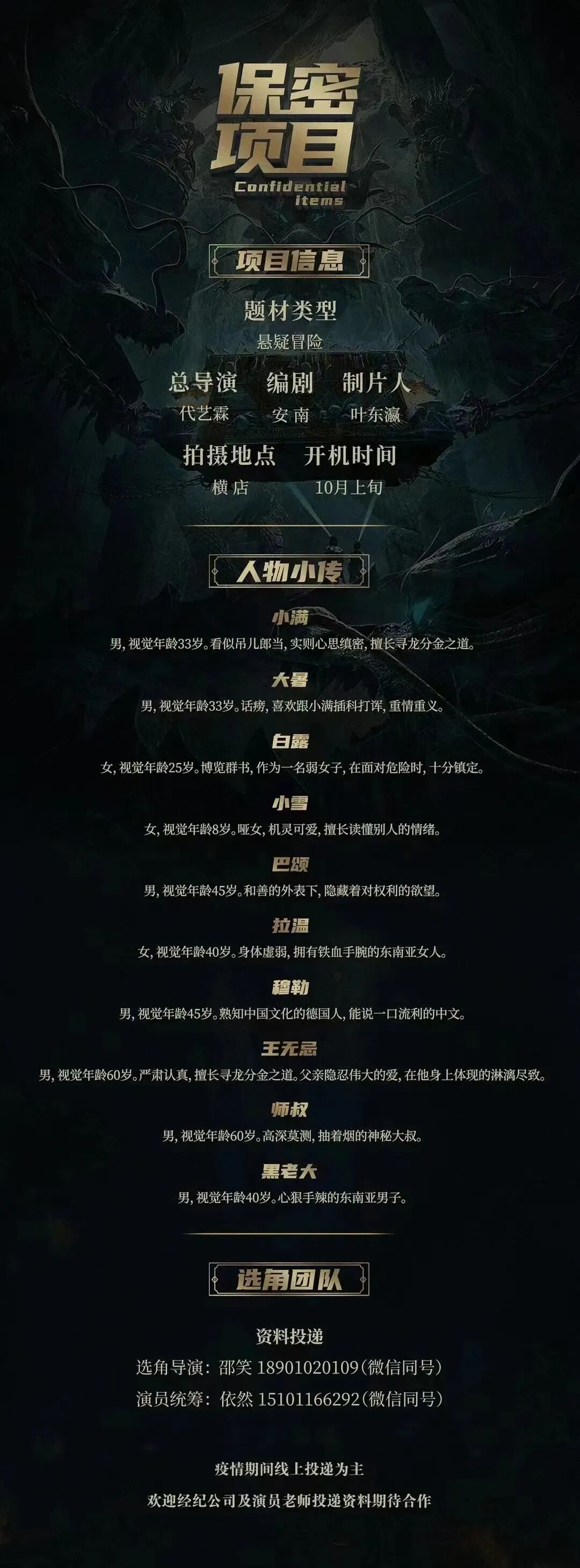 众多角色未定,欢迎各大经纪公司,经纪人及演员投递资料,因疫情原因只接受线上。