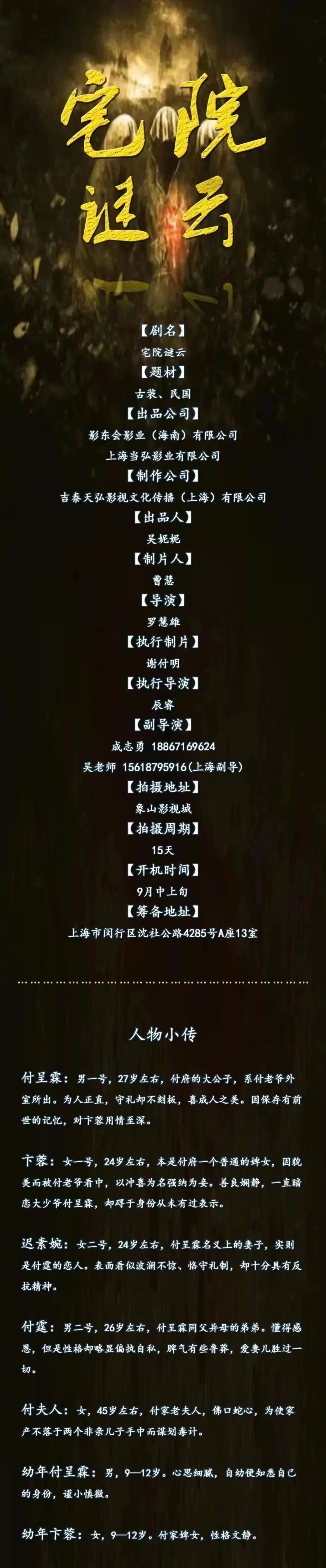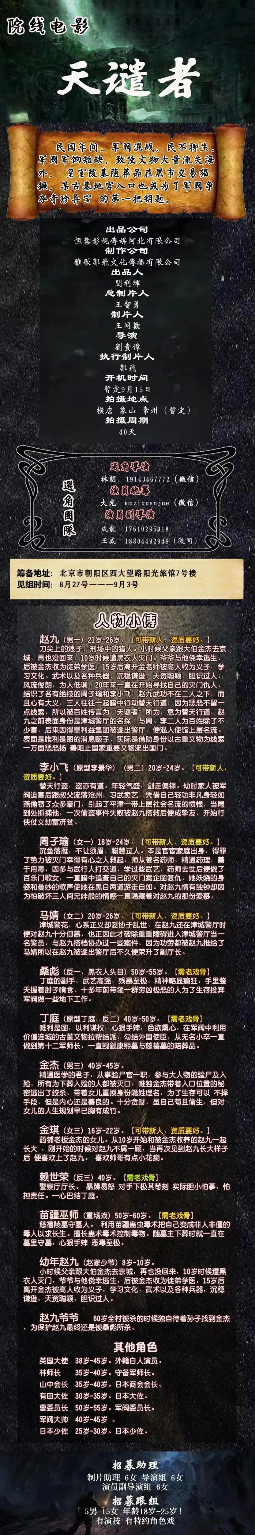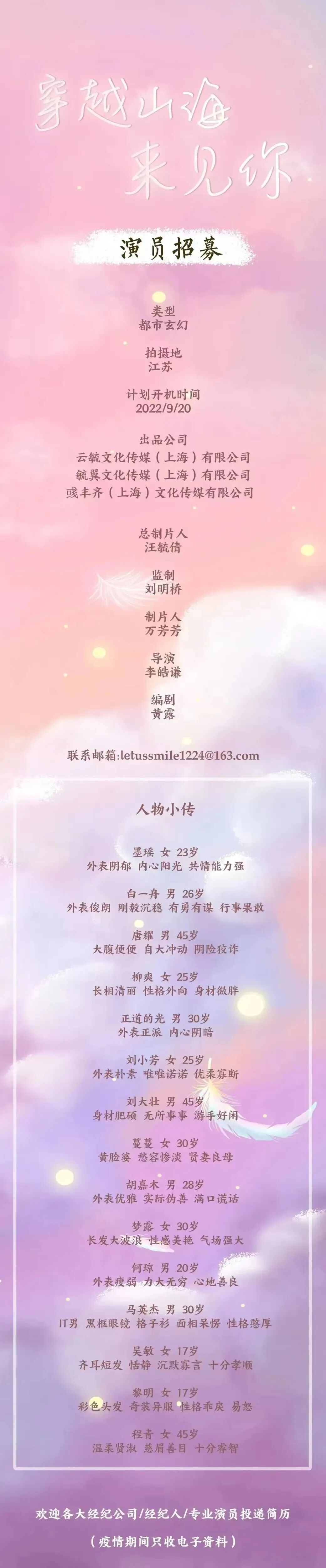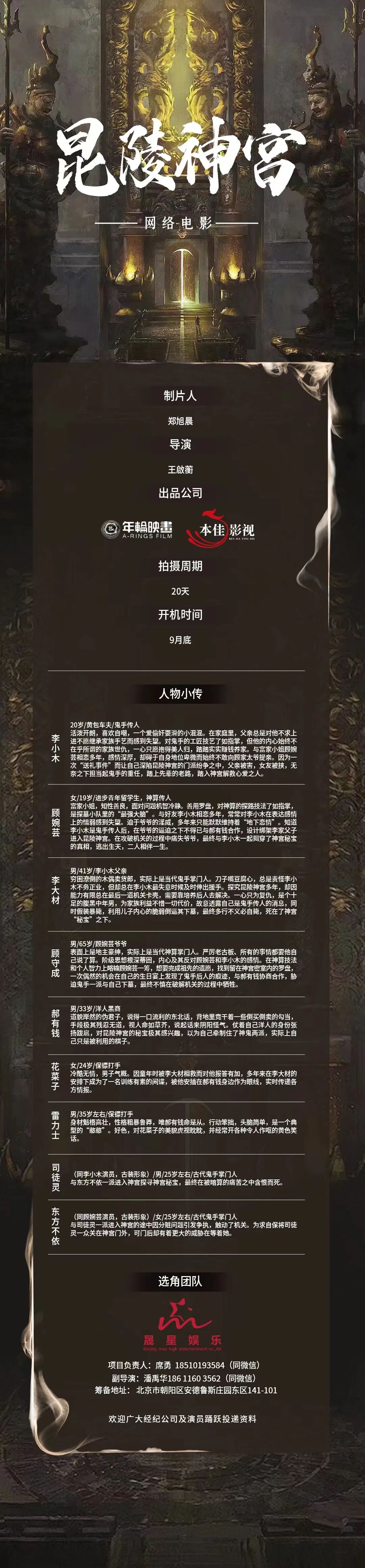 片中大量角色未定,欢迎各大经纪公司和艺人朋友们相互推荐,鼎力支持。