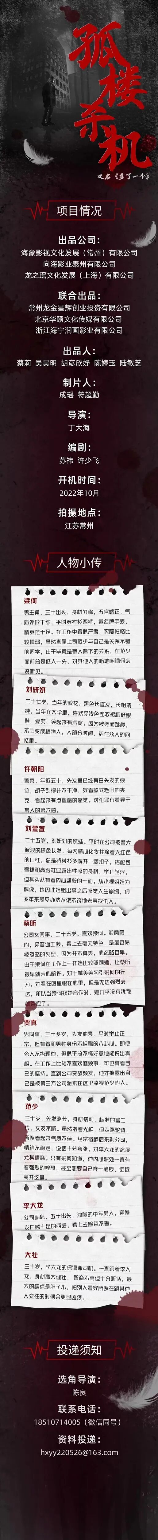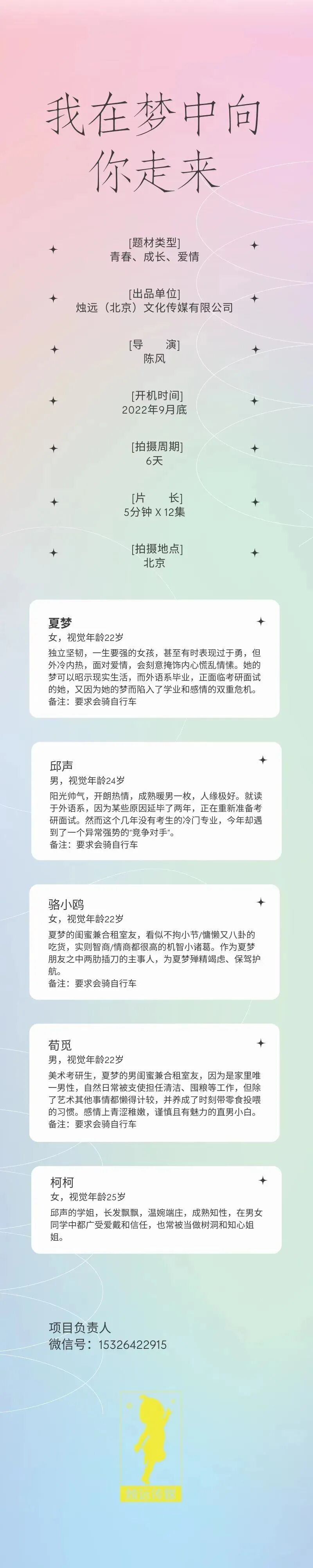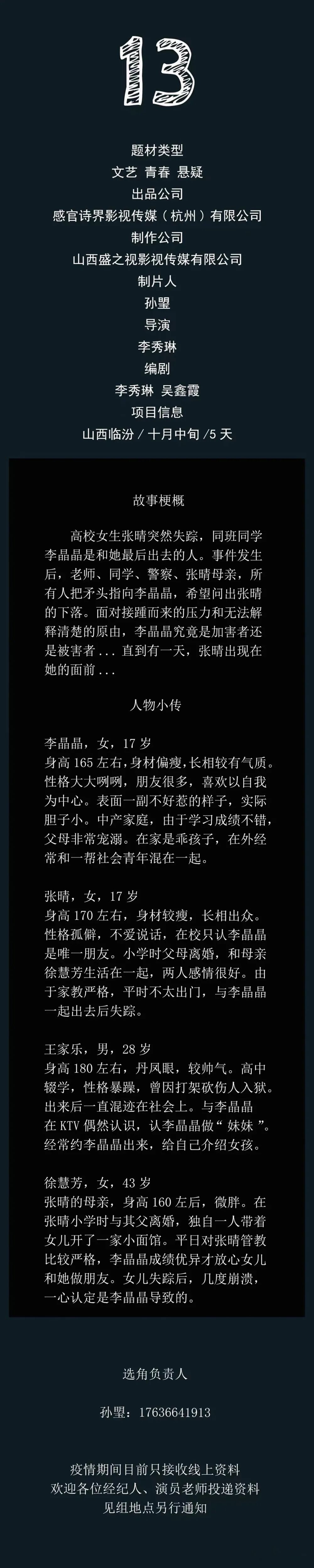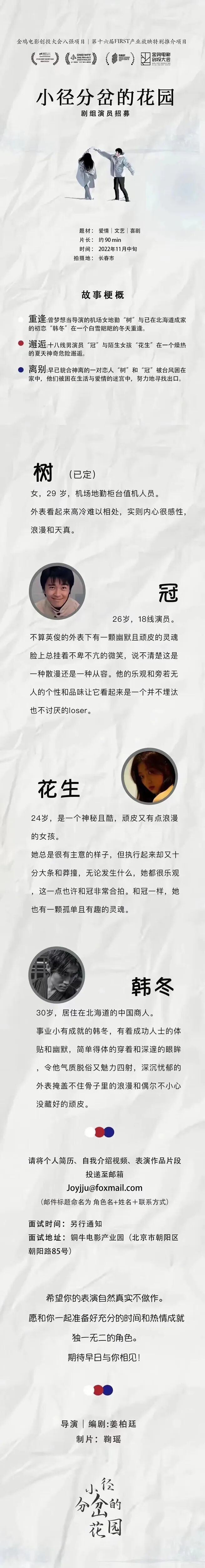 片中大量角色未定,欢迎各大经纪公司和艺人朋友们相互推荐,鼎力支持。