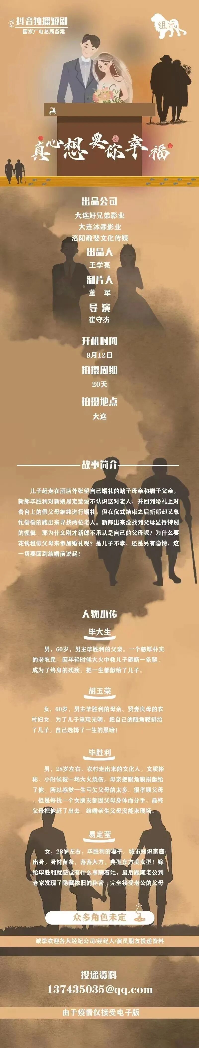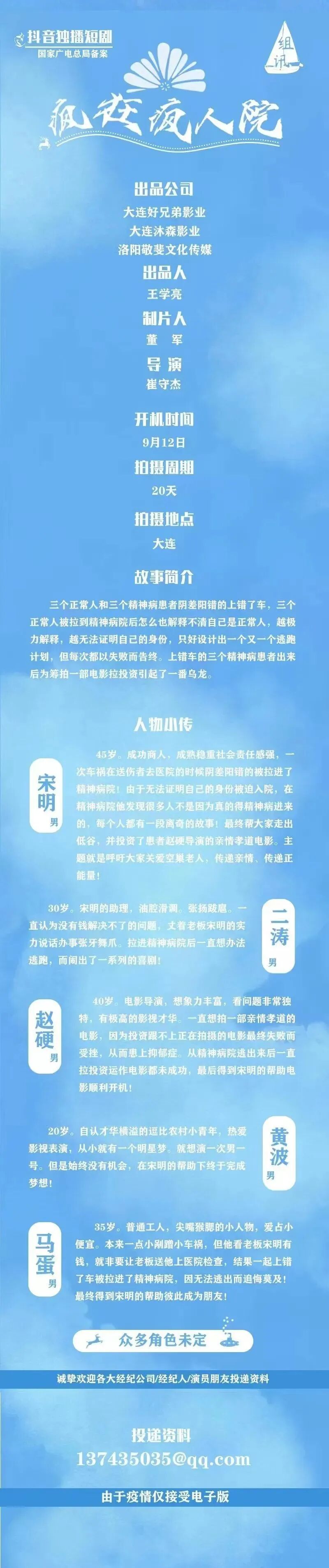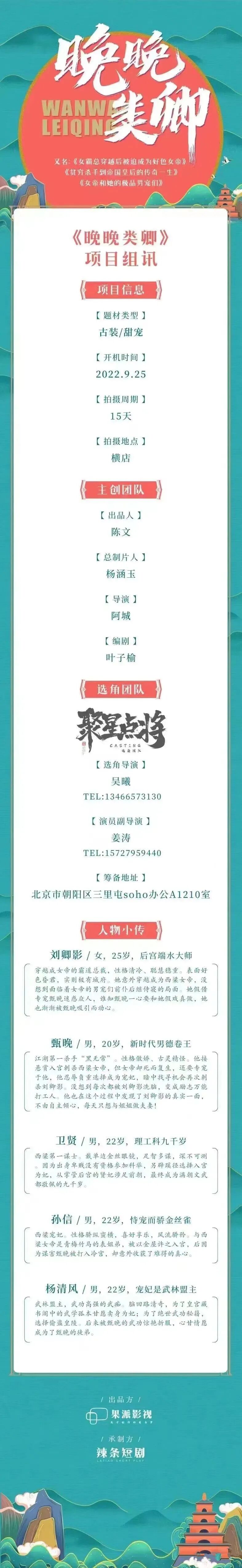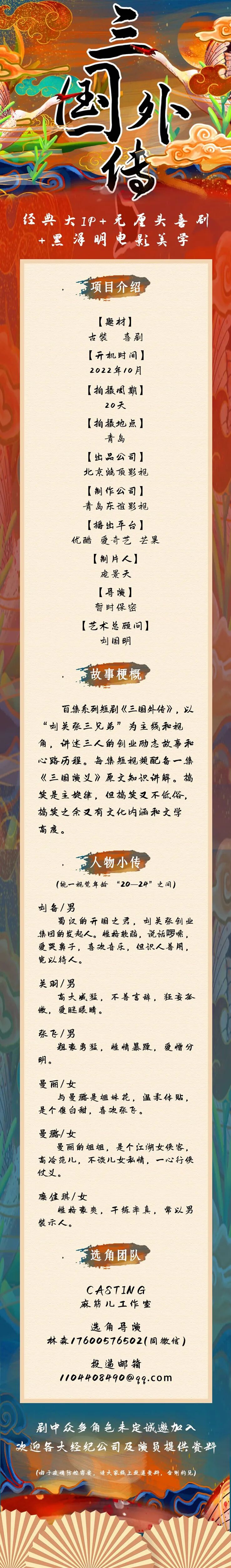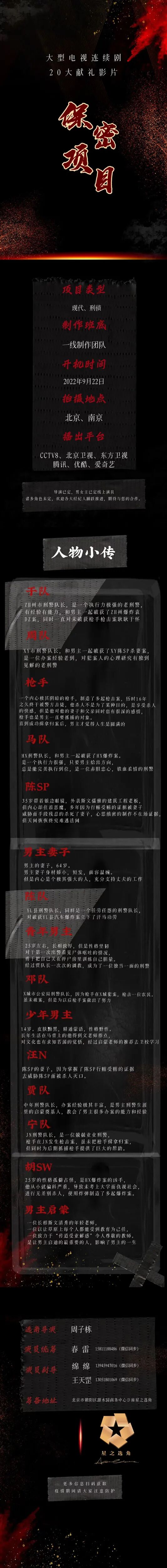 导演已定,男女主已定线上演员,诸多角色未定,欢迎各大经纪人踊跃推进,期待与您的合作。