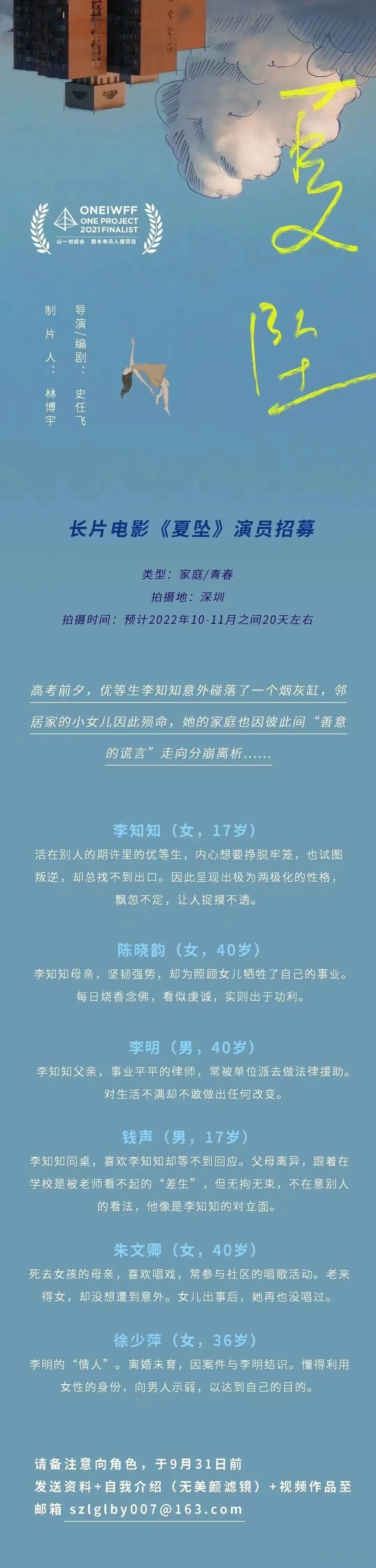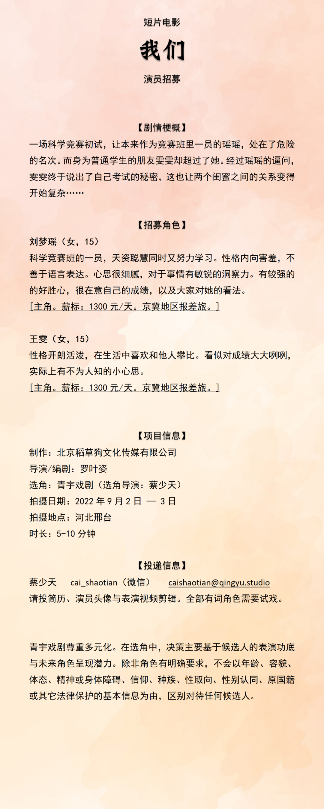 请备注意向角色,于9月31日前发送资料+自我介绍(无美颜滤镜)+视频作品至邮箱。