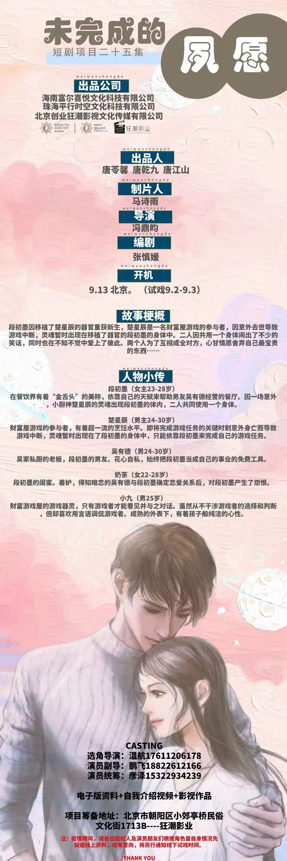 欢迎各大经纪,各个演员的鼎力支持。另招跟组演员20人