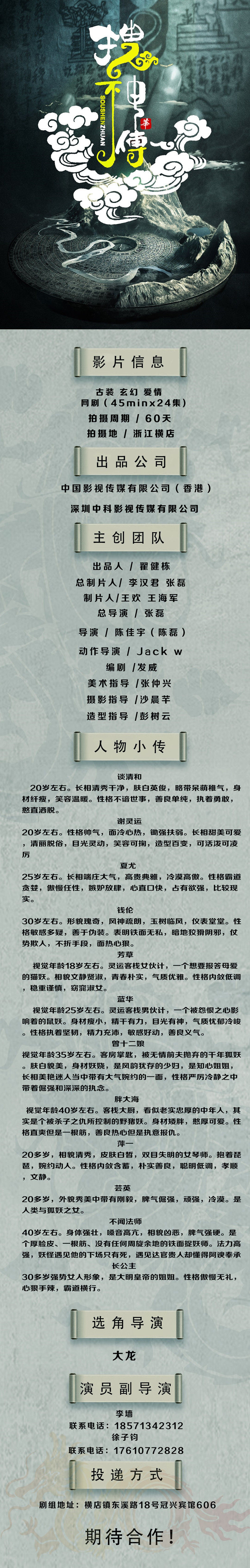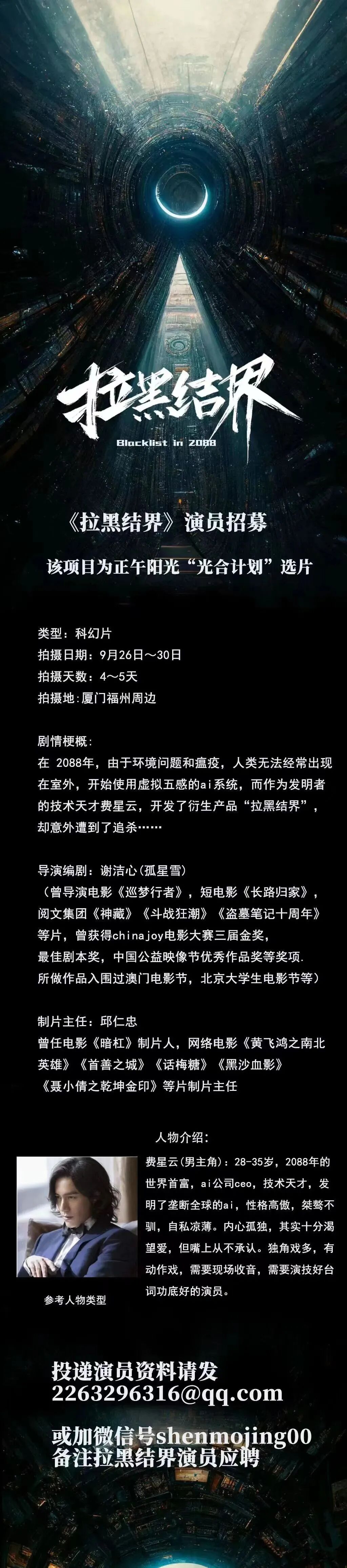 投递演员资料请发邮箱或加微信号,备注拉黑结界演员投递