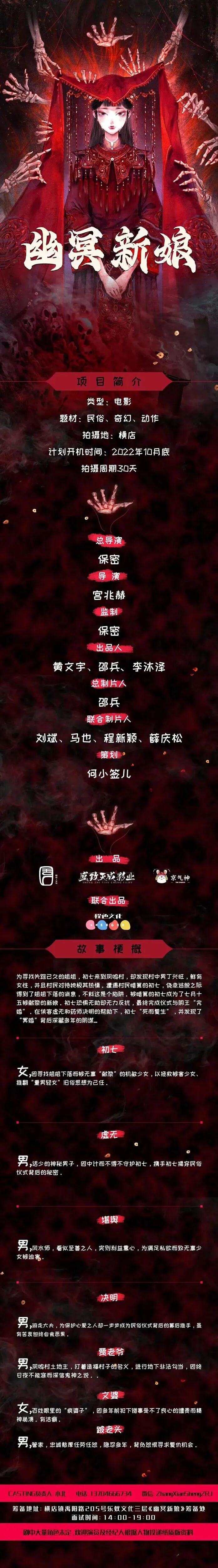 筹备地址:横店镇禹阳路205号乐蚁文化三层《幽冥新娘》筹备处