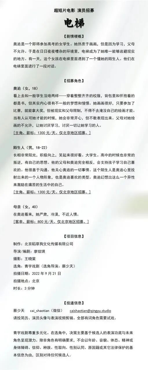 资料要求:拟应角色名+真实姓名+联系方式邮件请附个人信息及简短素颜自我介绍视频