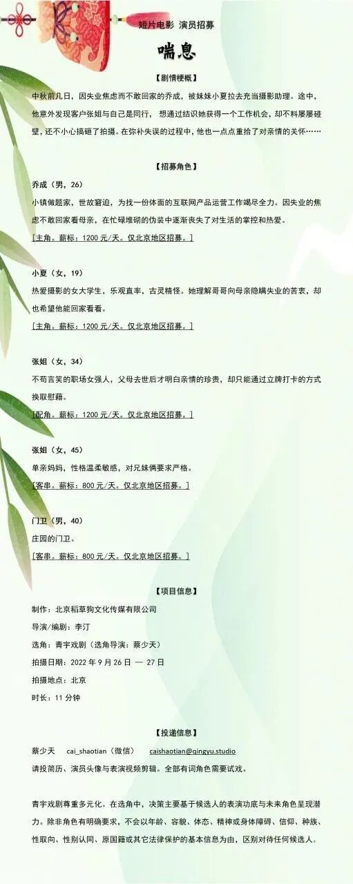 选角负责人:小黑哥哥 19157387930(微信同步)