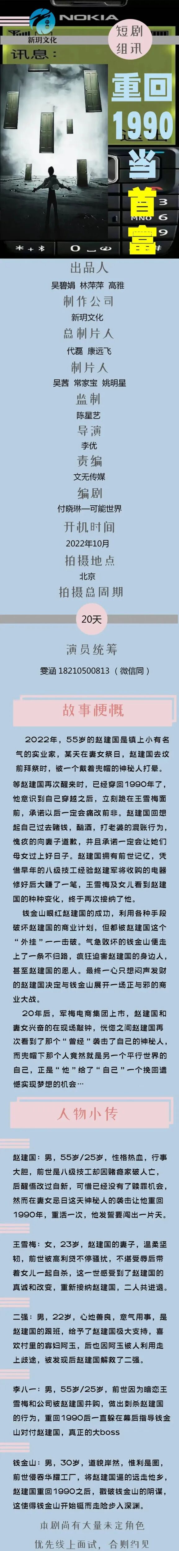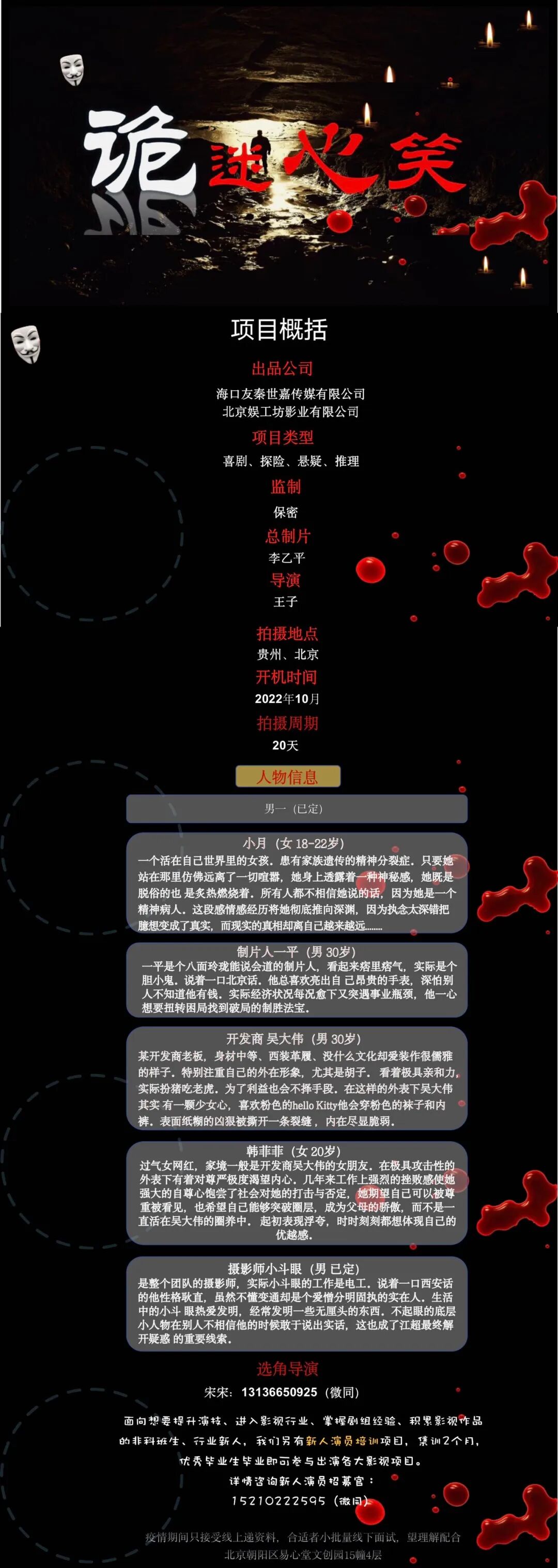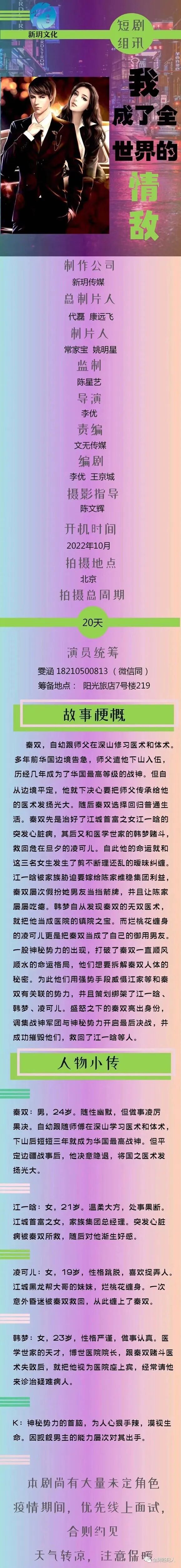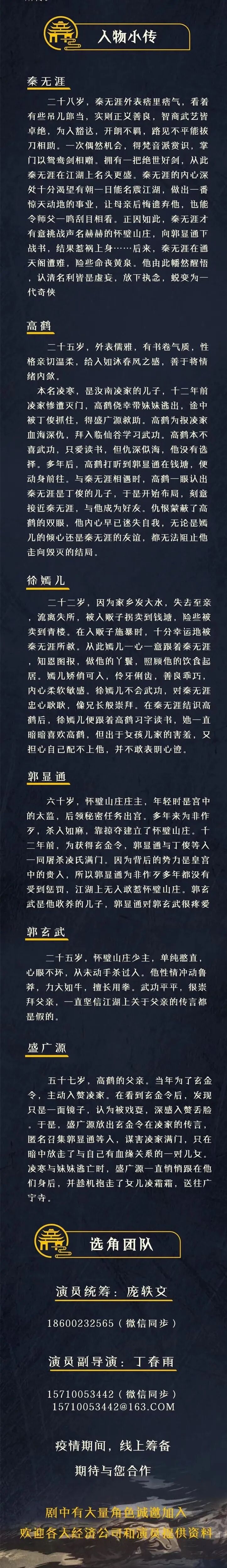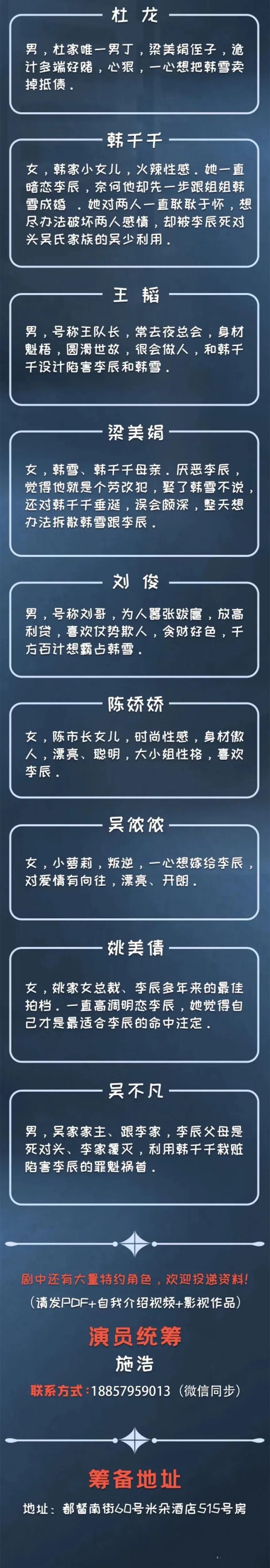 剧中有大量角色诚邀加入,欢迎各大经纪公司和演员提供资料