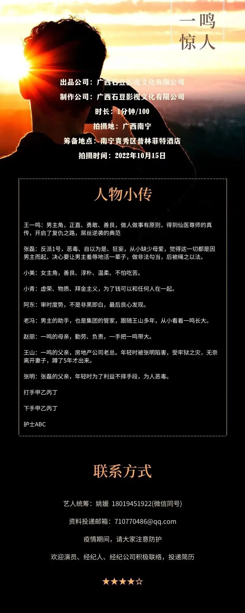 疫情期间,请大家注意防护,欢迎演员、经纪人、经纪公司积极联络,投递简历。