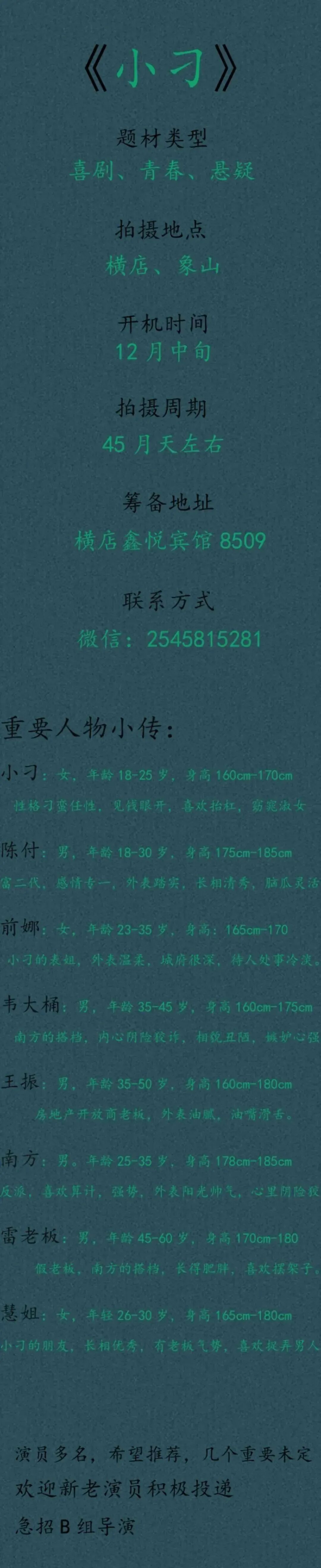 本栏目发布组讯由小编采集与业界共享,组讯如有变化请以实际情况为准。如果遇到剧组收费情况,请谨慎对待并私信官微@戏客Seeker,我们会公示问题组讯并及时处理。谢谢。