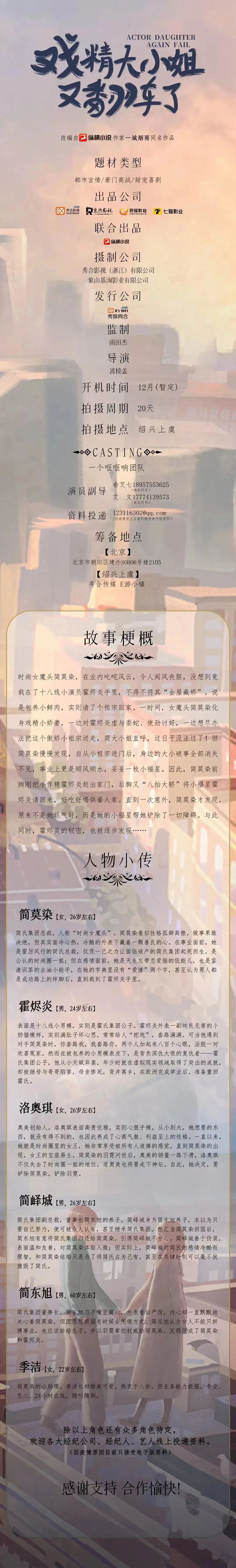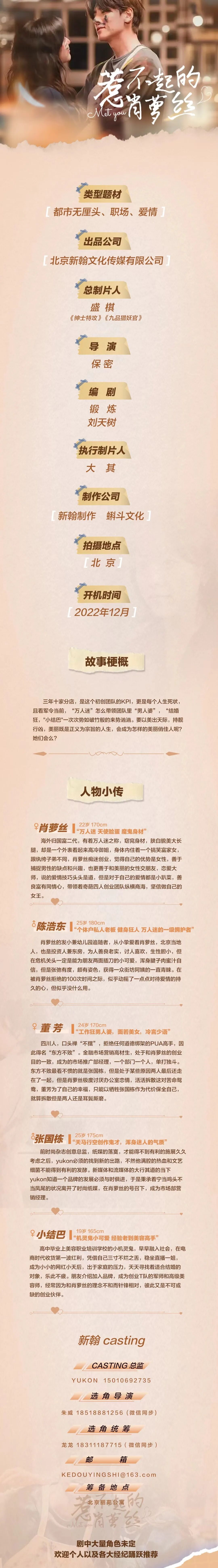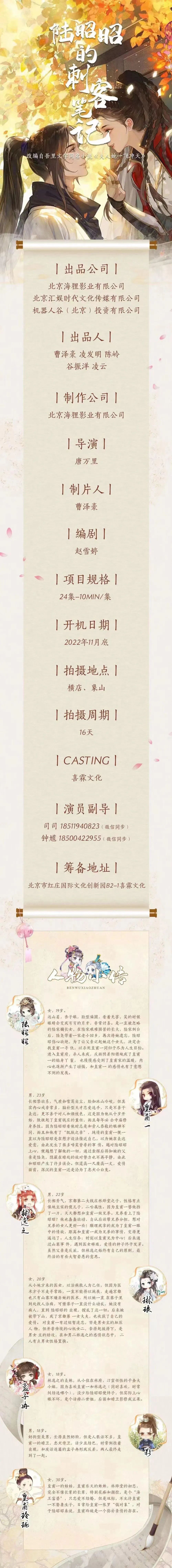 剧中所有角色未定,欢迎各大经纪公司和艺人踊跃投递资料。