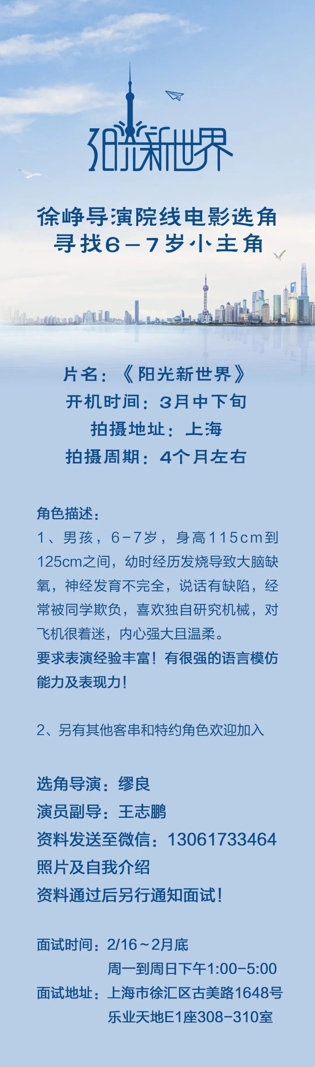徐峥导演院线电影选角,寻找6-7岁小主角。资料发送至微信,照片及自我介绍,资料通过后另行通知面试!