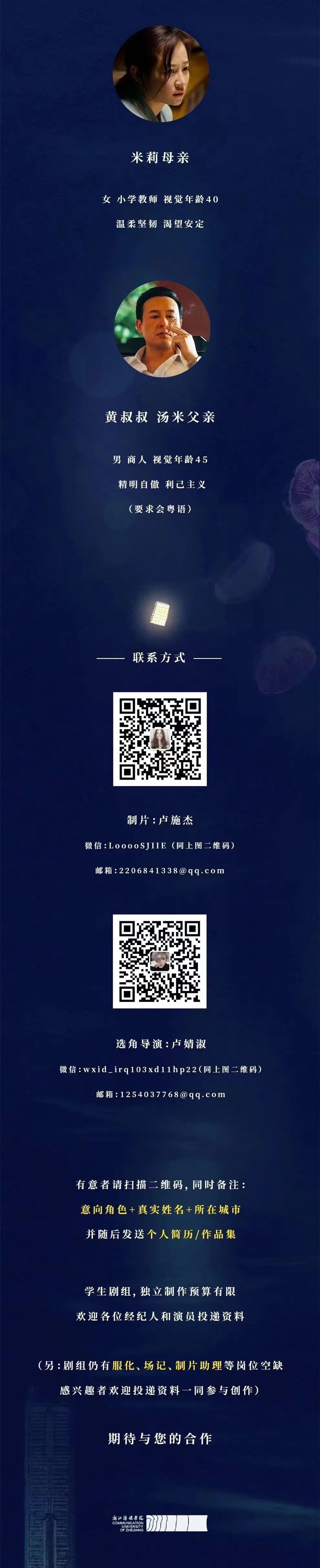 (另:剧组仍有服化、场记、制片助理等岗位空缺感兴趣者欢迎投递资料一同参与创作)期待与您的合作。
