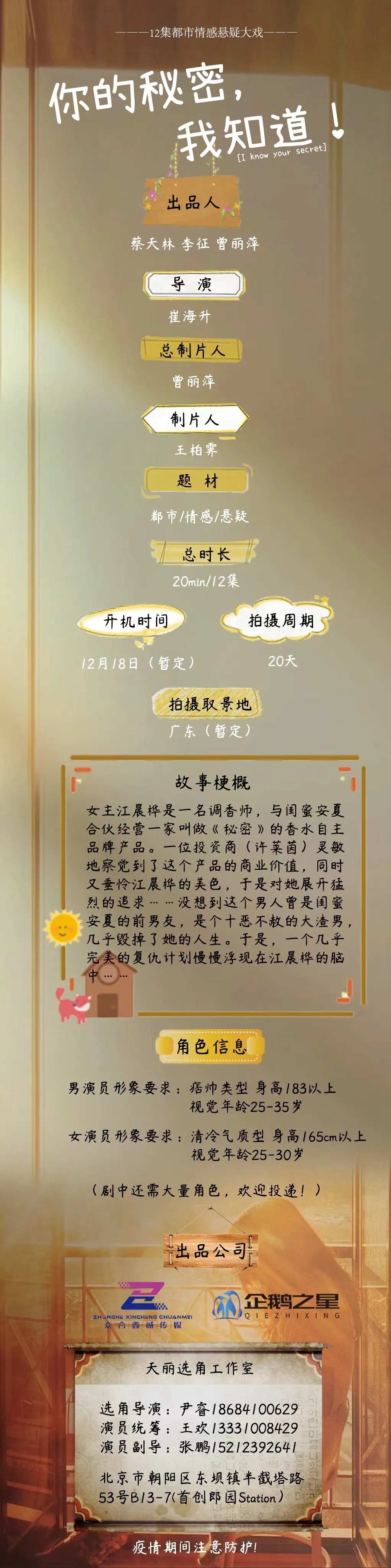 本栏目发布组讯由小编采集与业界共享,组讯如有变化请以实际情况为准。如果遇到剧组收费情况,请谨慎对待并私信官微@戏客Seeker,我们会公示问题组讯并及时处理。谢谢。
