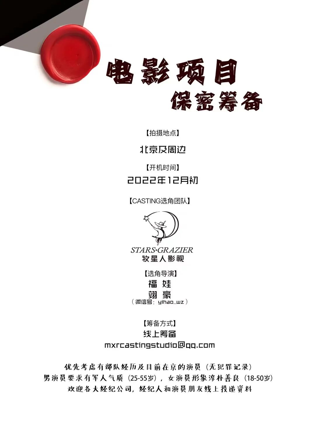 优先考虑有部队经历及目前在京的演员(无犯罪记录)男演员要求有军人气质(25-55岁),女演员形象淳朴善良(18-50岁,欢迎各大经纪公司,经纪人和演员朋友线上投递资料。