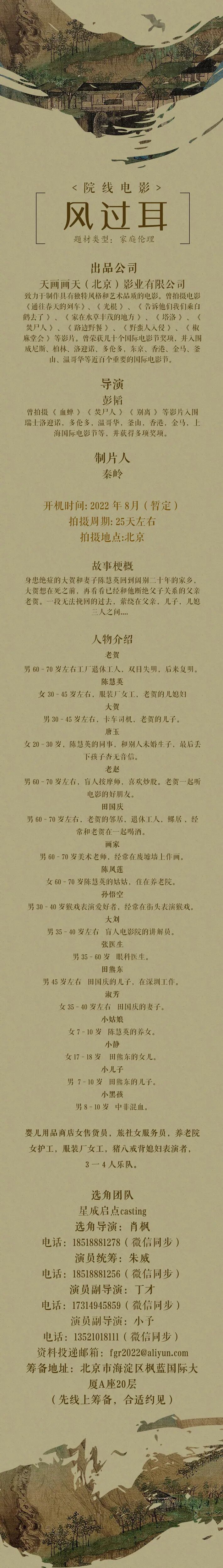 选角导演:冯雷 13601256189(同微信)
