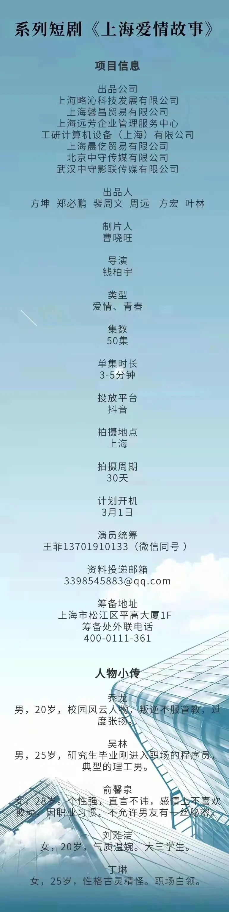 选角负责人:梁潇 18511845001(微信同步)