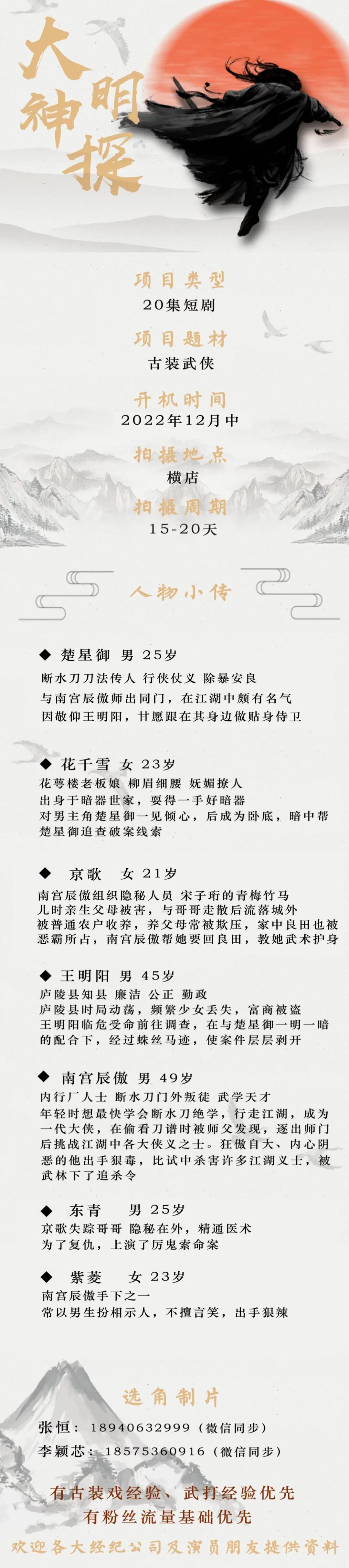 特殊时期线上筹备,剧中众多角色未定,欢迎演员及经纪人朋友踊跃投递资料。
