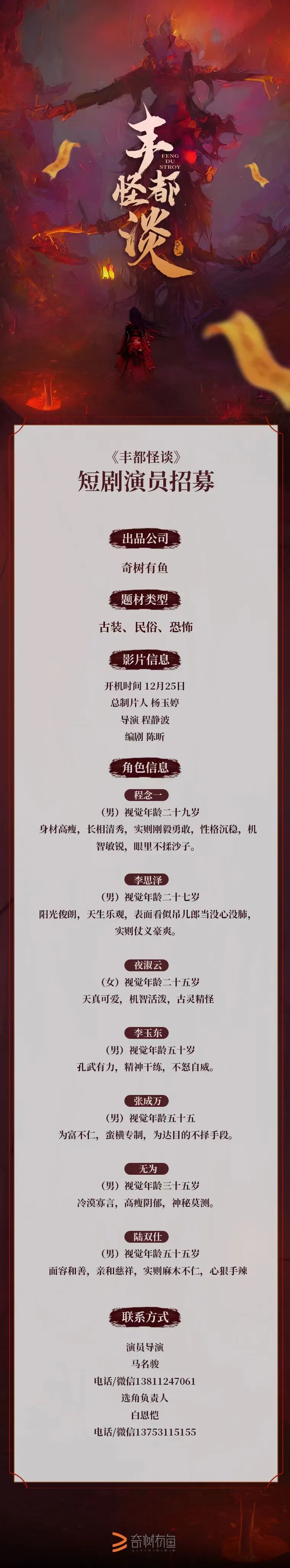 《丰都怪谈》已入驻横店筹备,大量角色未定,欢迎演员朋友前来投递资料。