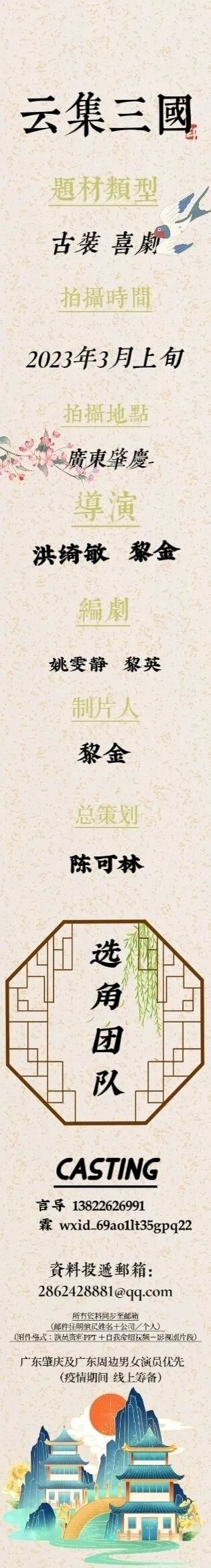 (附件格式:演员资料PPT+自我介绍视频+影视剧片段)广东肇庆及广东周边男女演员优先,疫情期间线上筹备。