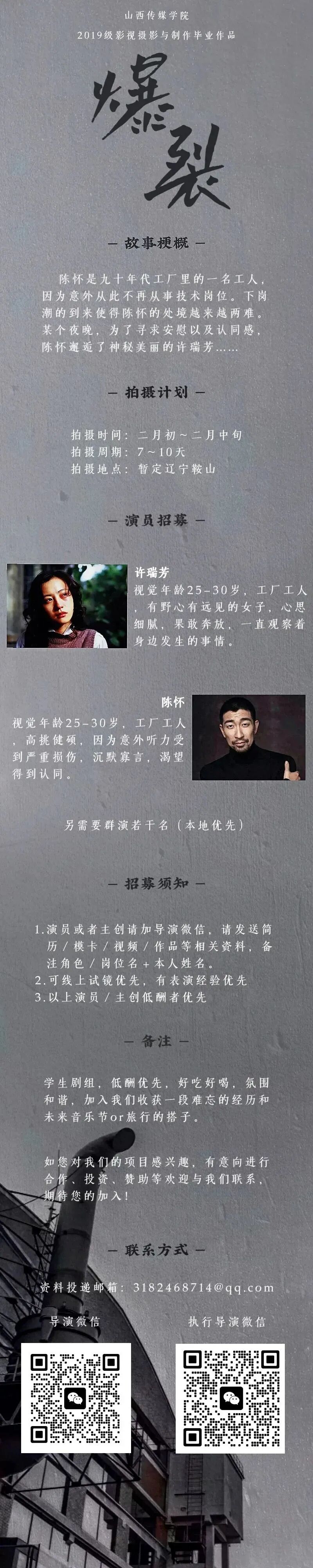 本栏目发布组讯由小编采集与业界共享,组讯如有变化请以实际情况为准。如果遇到剧组收费情况,请谨慎对待并私信官微@戏客Seeker,我们会公示问题组讯并及时处理。谢谢。