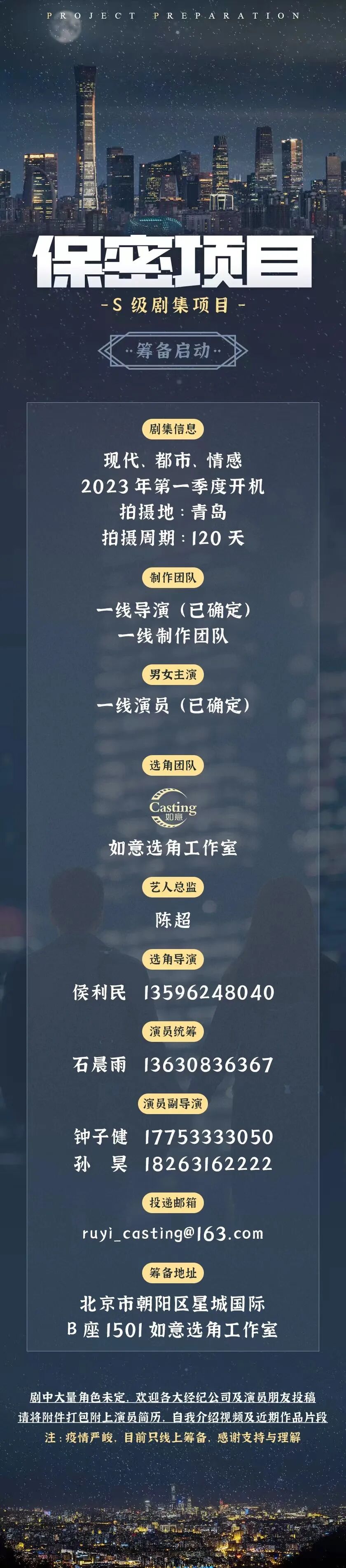 筹备地址:北京市朝阳区星城国际B座1501如意选角工作室