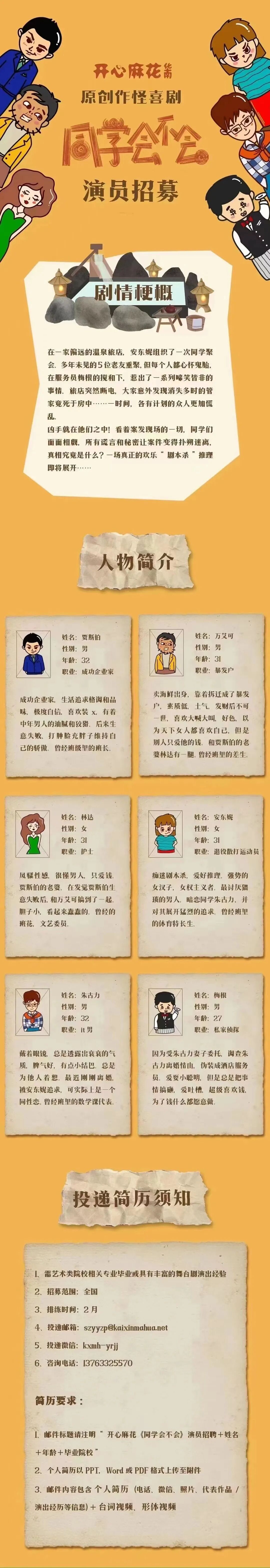 1、邮件标题请注明“开心麻花《同学会不会》演员招聘+姓名十年龄十毕业院校”