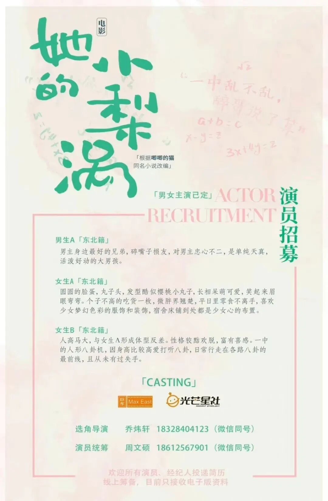 男女主演已定,欢迎所有演员、经纪人投递资料,线上筹备,目前只接收电子版资料。