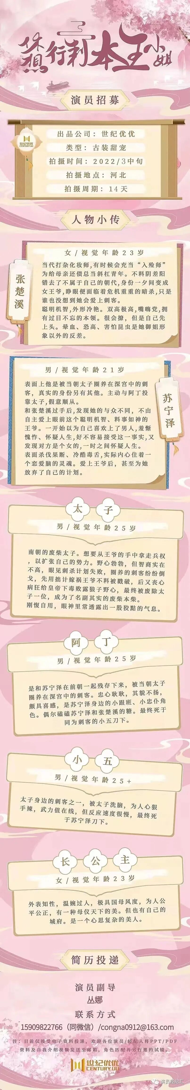目前仅接受电子资料投递,欢迎各位演员/经纪人将PPT/PDF资料及自我介绍视频发送至邮箱,角色匹配再另行邀约试镜。